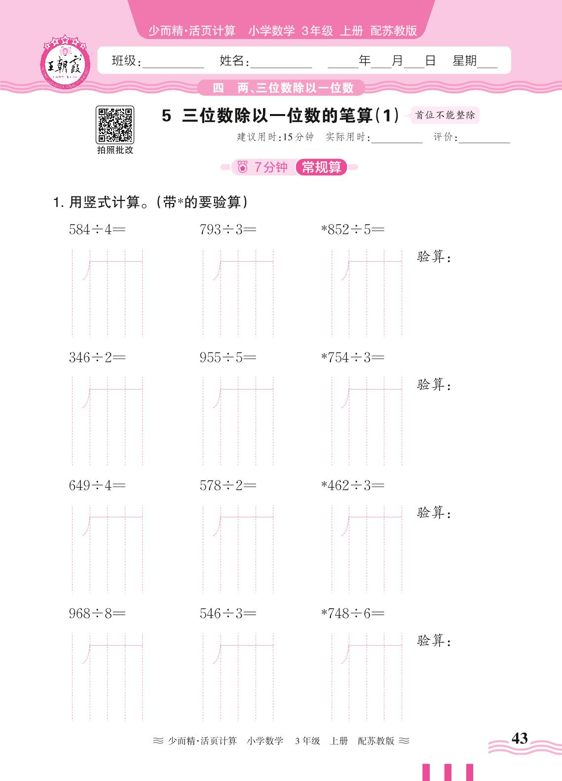 2024秋上册三年级数学苏教版 第四单元 两、三位数除以一位数——5. 三位数除以一位数的笔算(1)