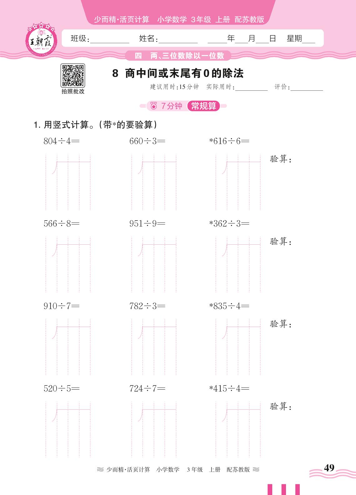 2024秋上册三年级数学苏教版 第四单元 两、三位数除以一位数——8. 商中间或末尾有0的除法
