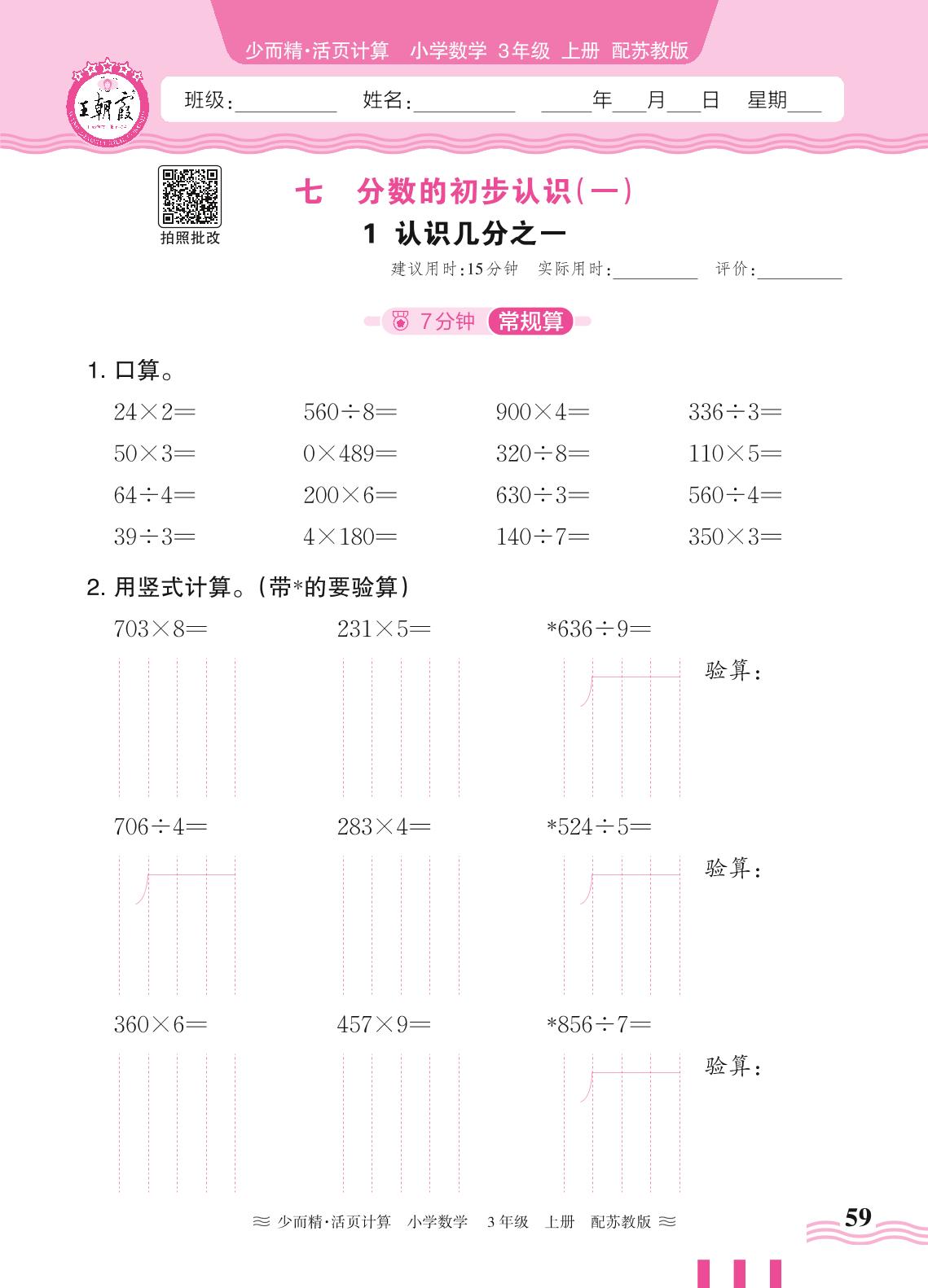 2024秋上册三年级数学苏教版 第七单元 分数的初步认识(一)——1. 认识几分之一