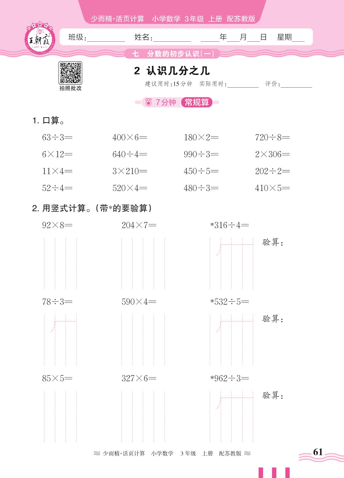 2024秋上册三年级数学苏教版 第七单元 分数的初步认识(一)——2. 认识几分之几