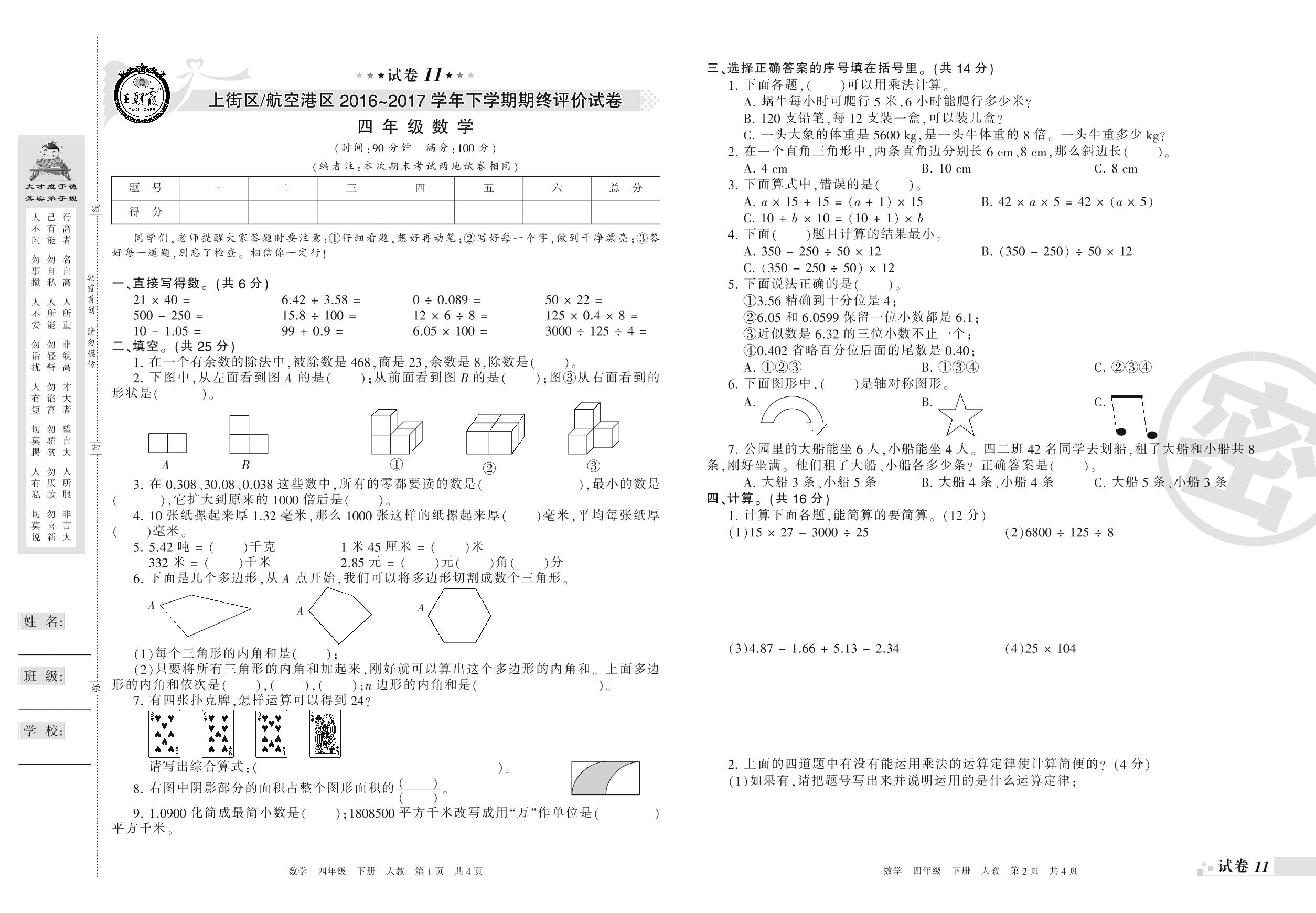 2016-2017学年第二学期郑州市上街区四年级数学试卷(人教版)【11】