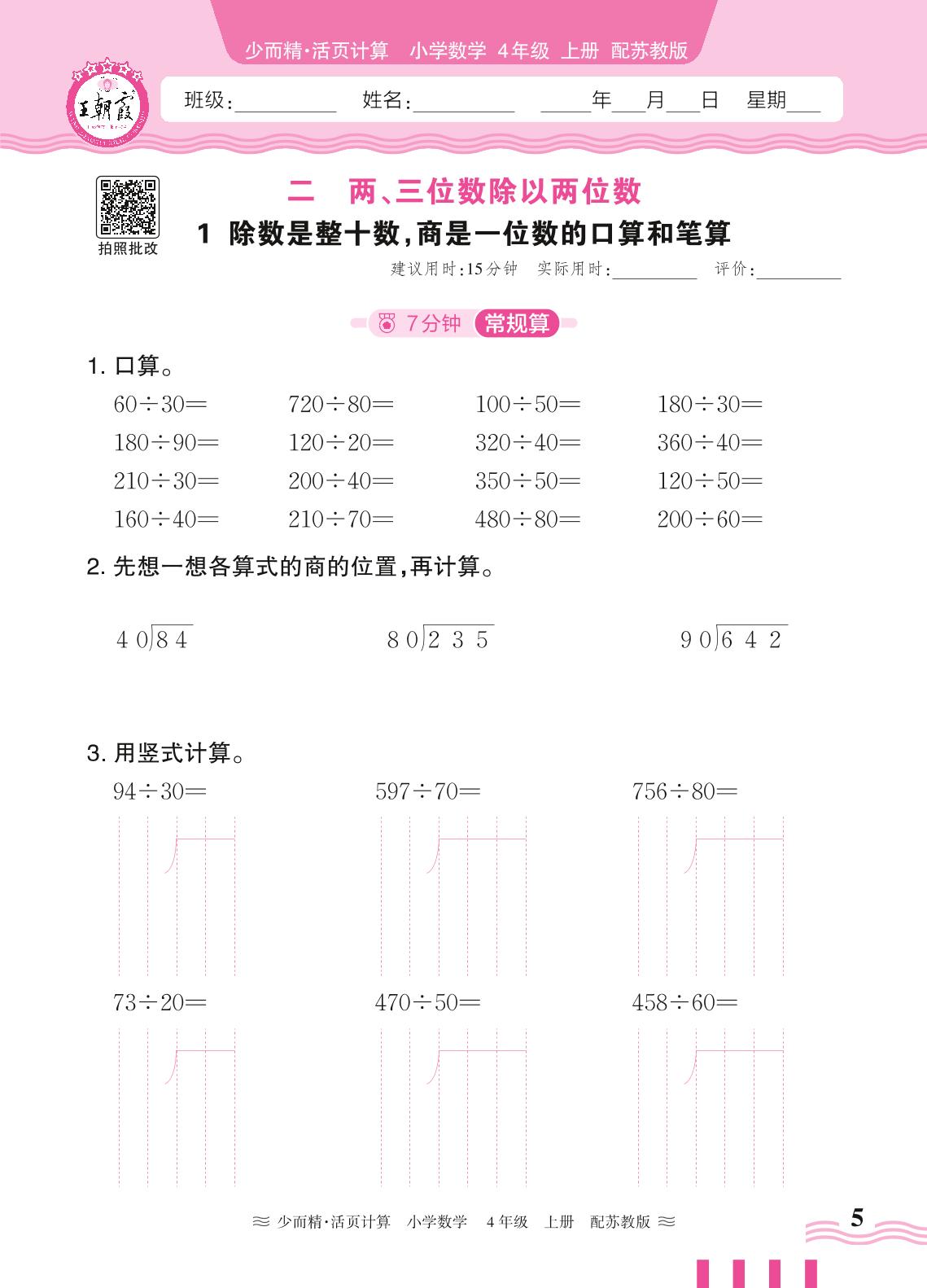 2024秋上册四年级数学苏教版 第二单元 两、三位数除以两位数——1. 除数是整十数,商是一位数的口算和笔算_R240819172006899