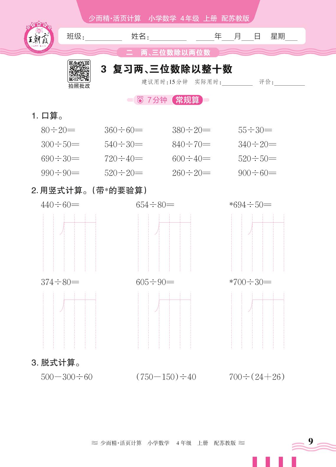 2024秋上册四年级数学苏教版 第二单元 两、三位数除以两位数——3. 复习两、三位数除以整十数