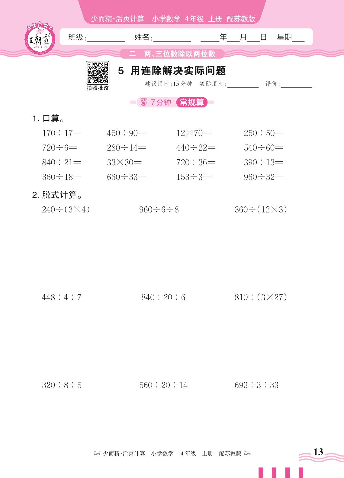 2024秋上册四年级数学苏教版 第二单元 两、三位数除以两位数——5. 用连除解决实际问题
