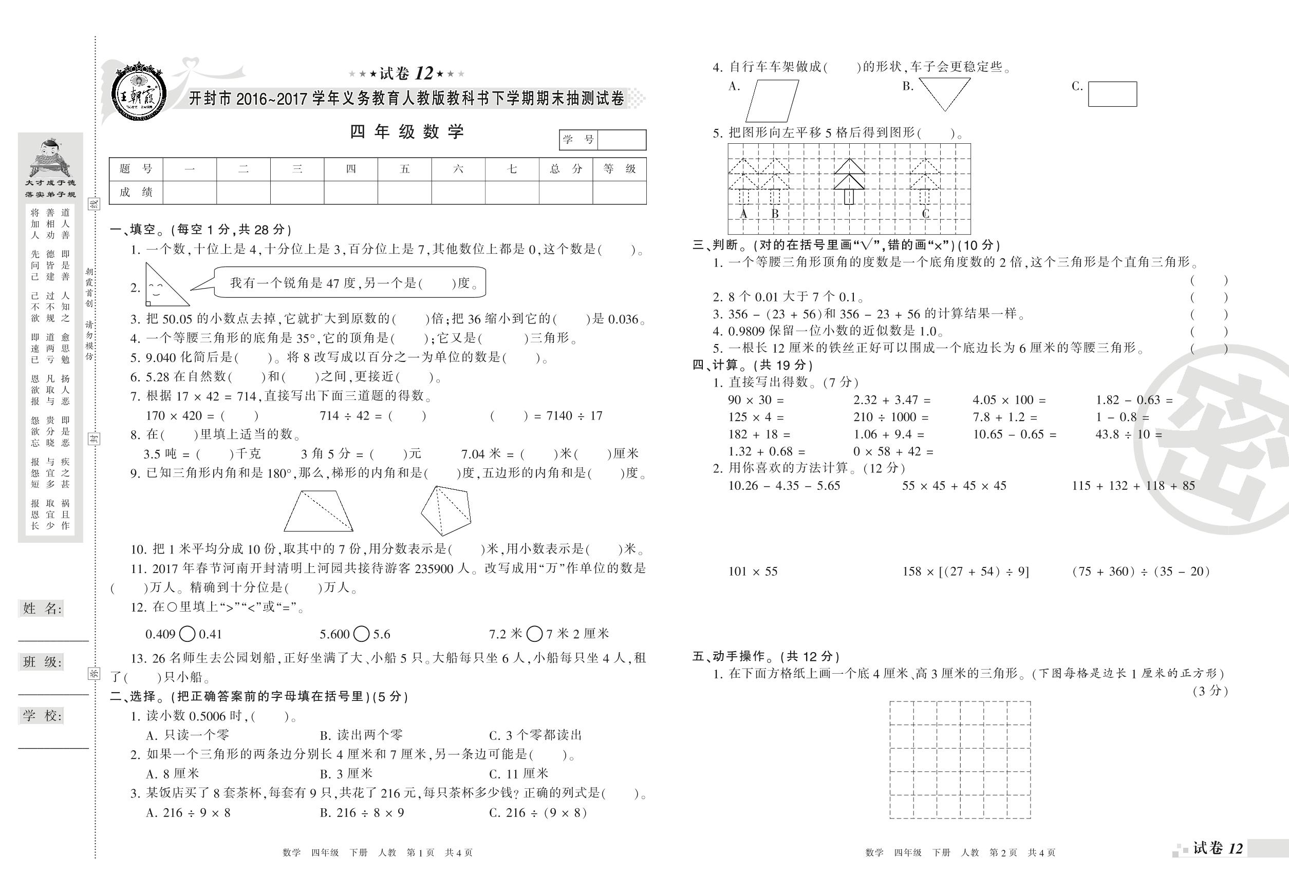 2016-2017学年第二学期开封市四年级数学试卷(人教版)【12】