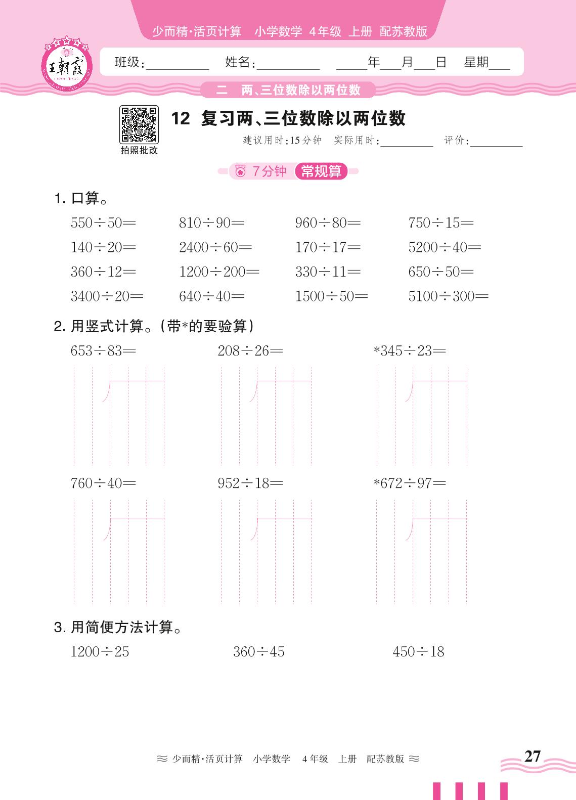 2024秋上册四年级数学苏教版 第二单元 两、三位数除以两位数——12. 复习两、三位数除以两位数