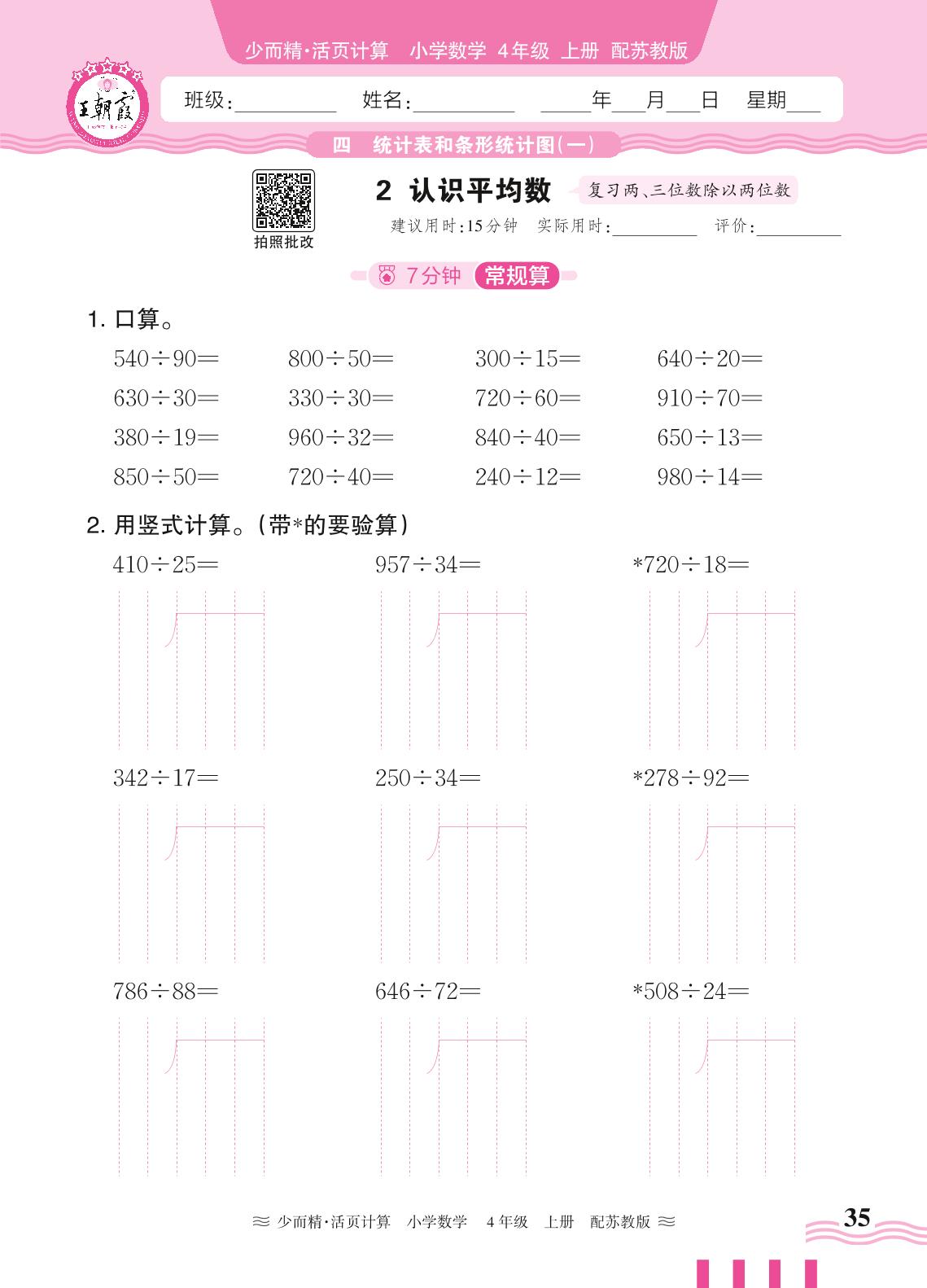 2024秋上册四年级数学苏教版 第四单元 统计表和条形统计图(一)——2. 认识平均数