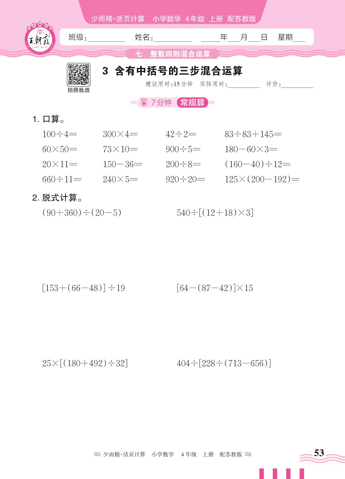2024秋上册四年级数学苏教版 第七单元 整数四则混合运算——3. 含有中括号的三步混合运算_R240819172015916