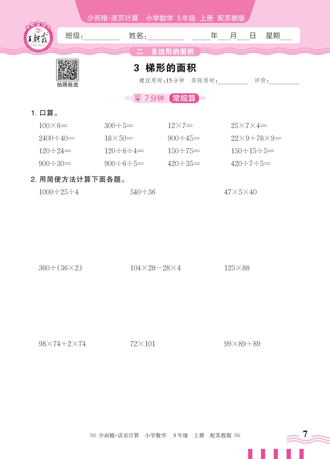 2024秋上册五年级数学苏教版 第二单元 多边形的面积——3. 梯形的面积