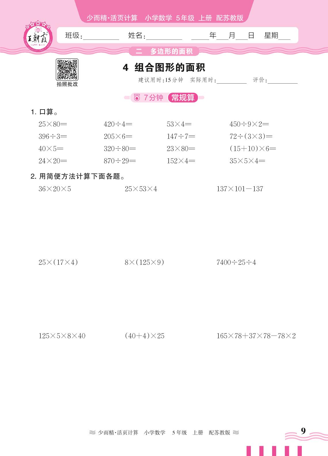 2024秋上册五年级数学苏教版 第二单元 多边形的面积——4. 组合图形的面积