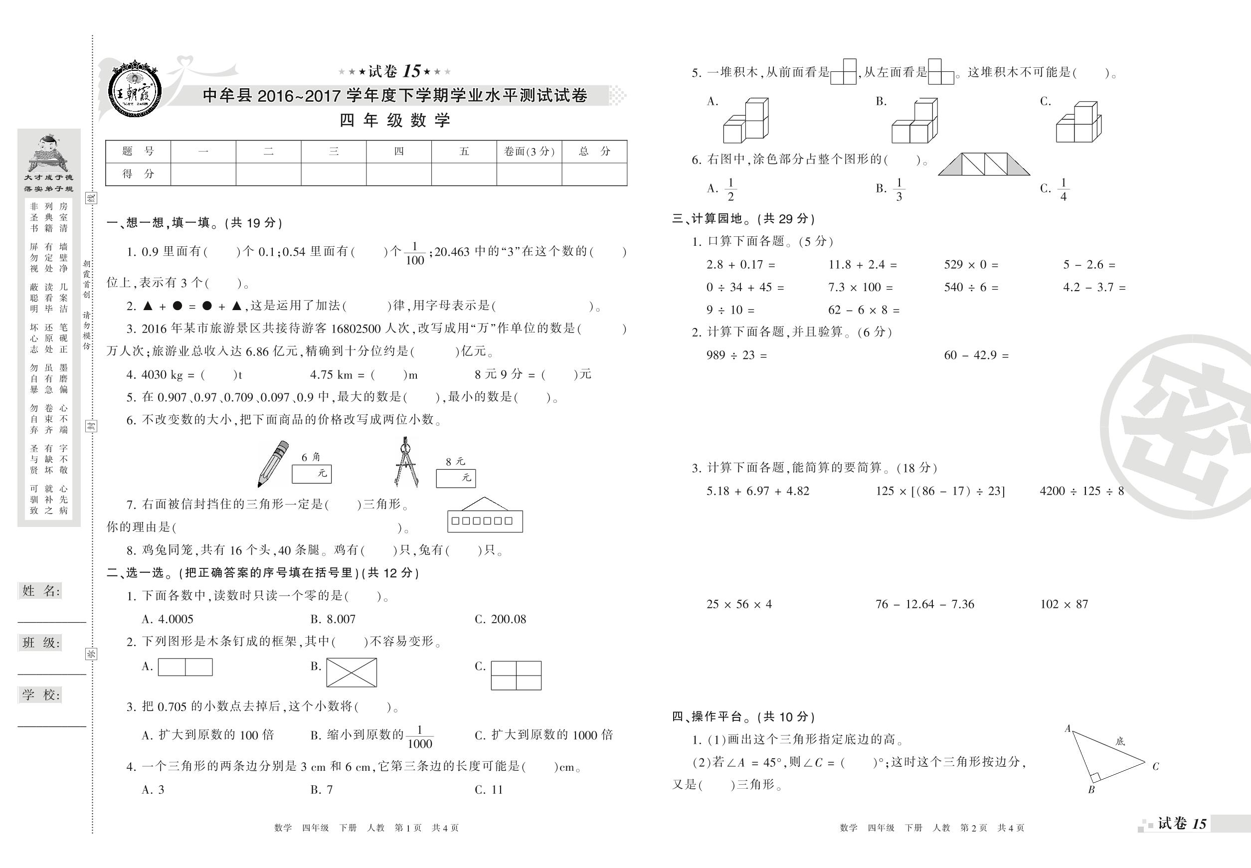 2016-2017学年第二学期郑州市中牟县四年级数学试卷(人教版)【15】
