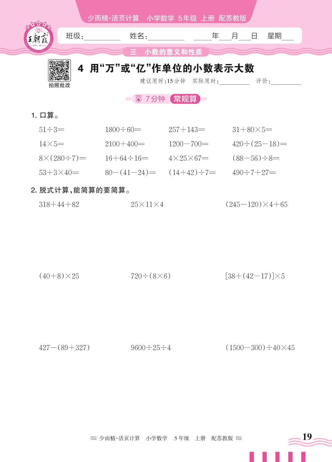 2024秋上册五年级数学苏教版 第三单元 小数的意义和性质——4. 用“万”或“亿”作单位的小数表示大数
