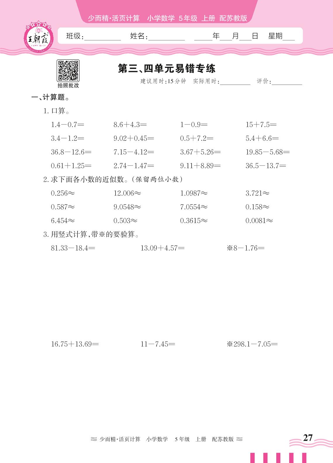 2024秋上册五年级数学苏教版 第三、四单元易错专练