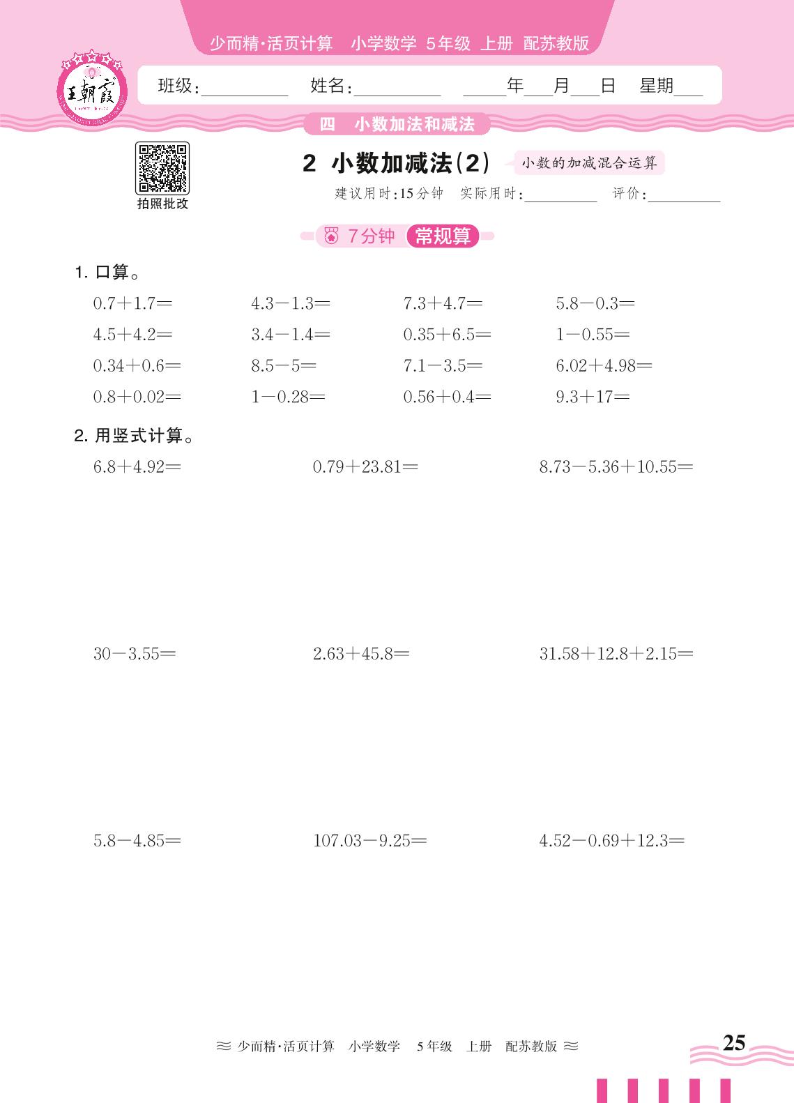 2024秋上册五年级数学苏教版 第四单元 小数加法和减法——2. 小数加减法(2)_R240819173632153