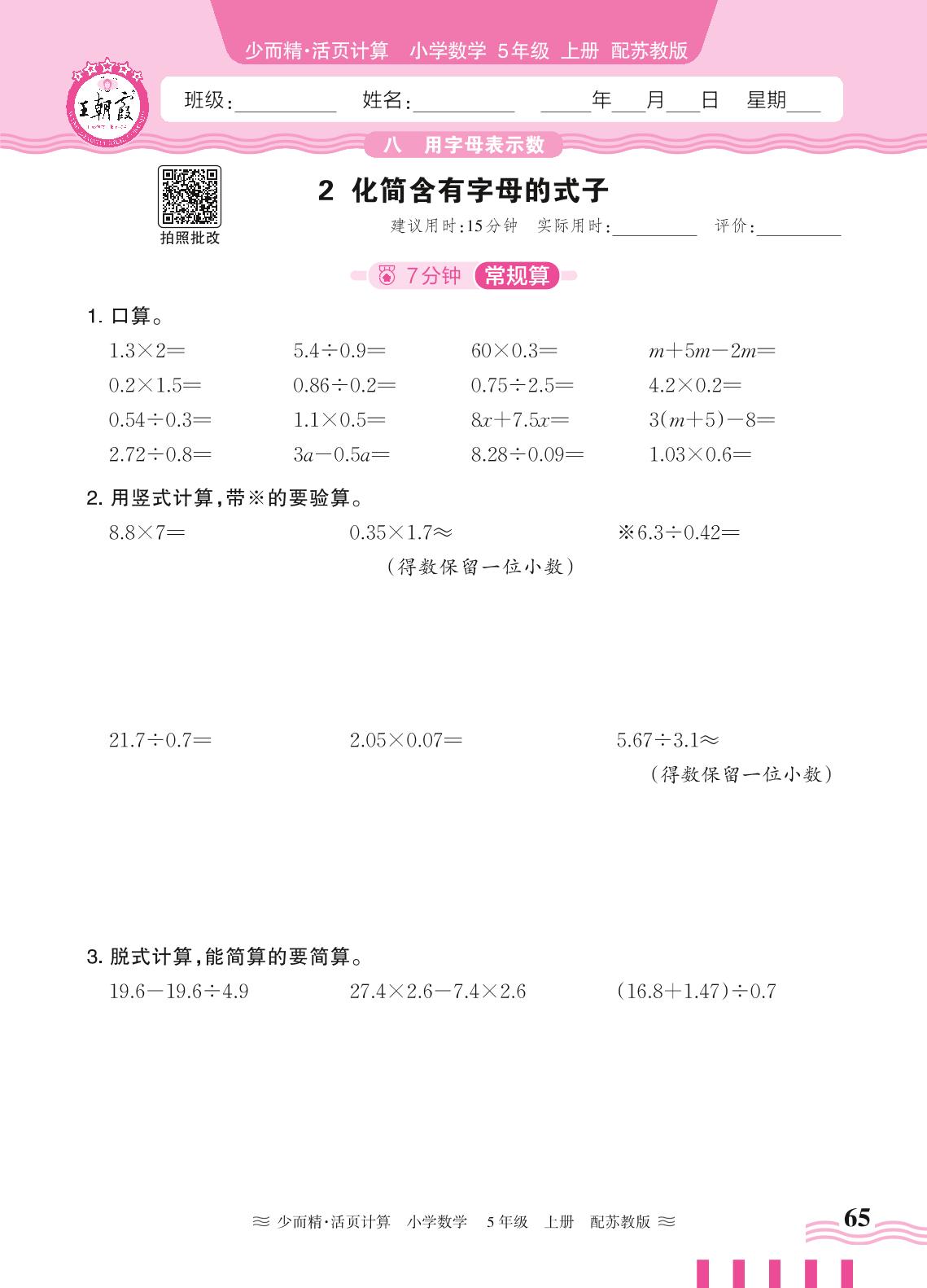 2024秋上册五年级数学苏教版 第八单元 用字母表示数——2. 化简含有字母的式子