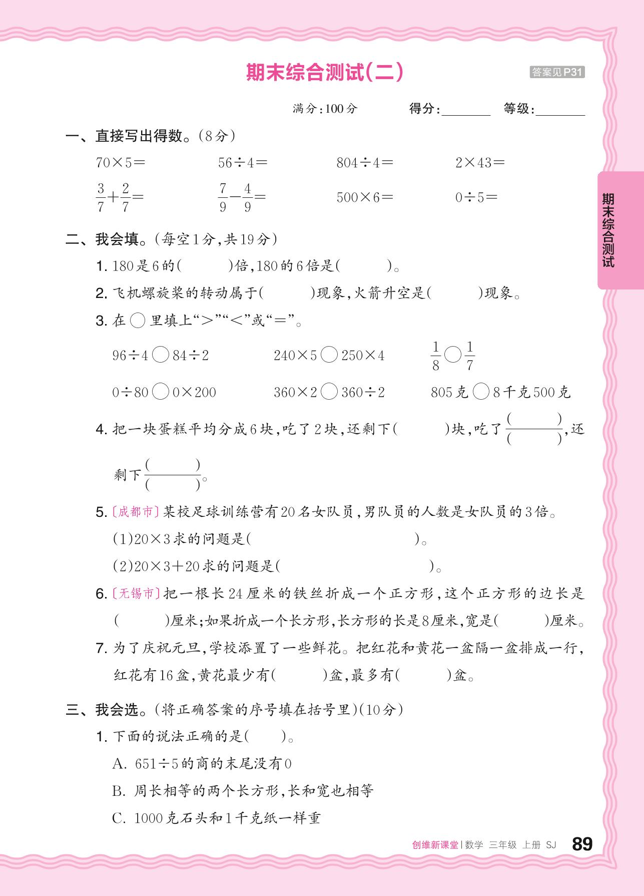 2024秋上册三年级数学苏教版 期末综合测试(二)