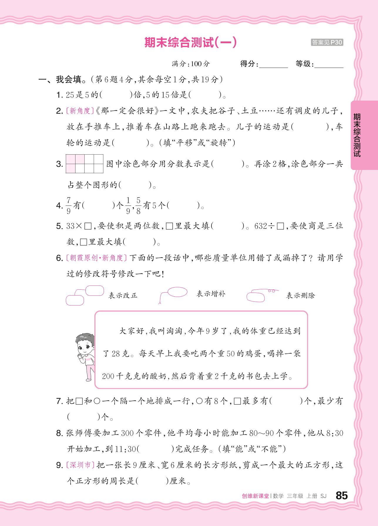 2024秋上册三年级数学苏教版 期末综合测试(一)
