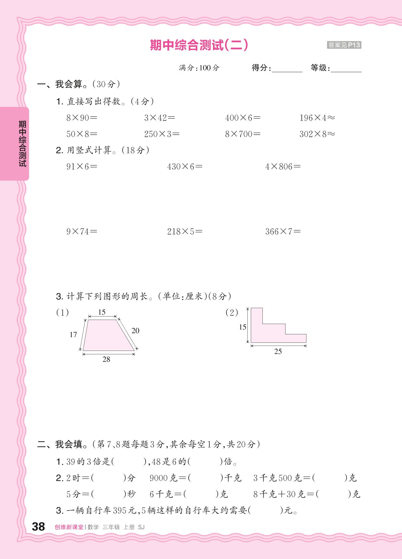 2024秋上册三年级数学苏教版 期中综合测试(二)