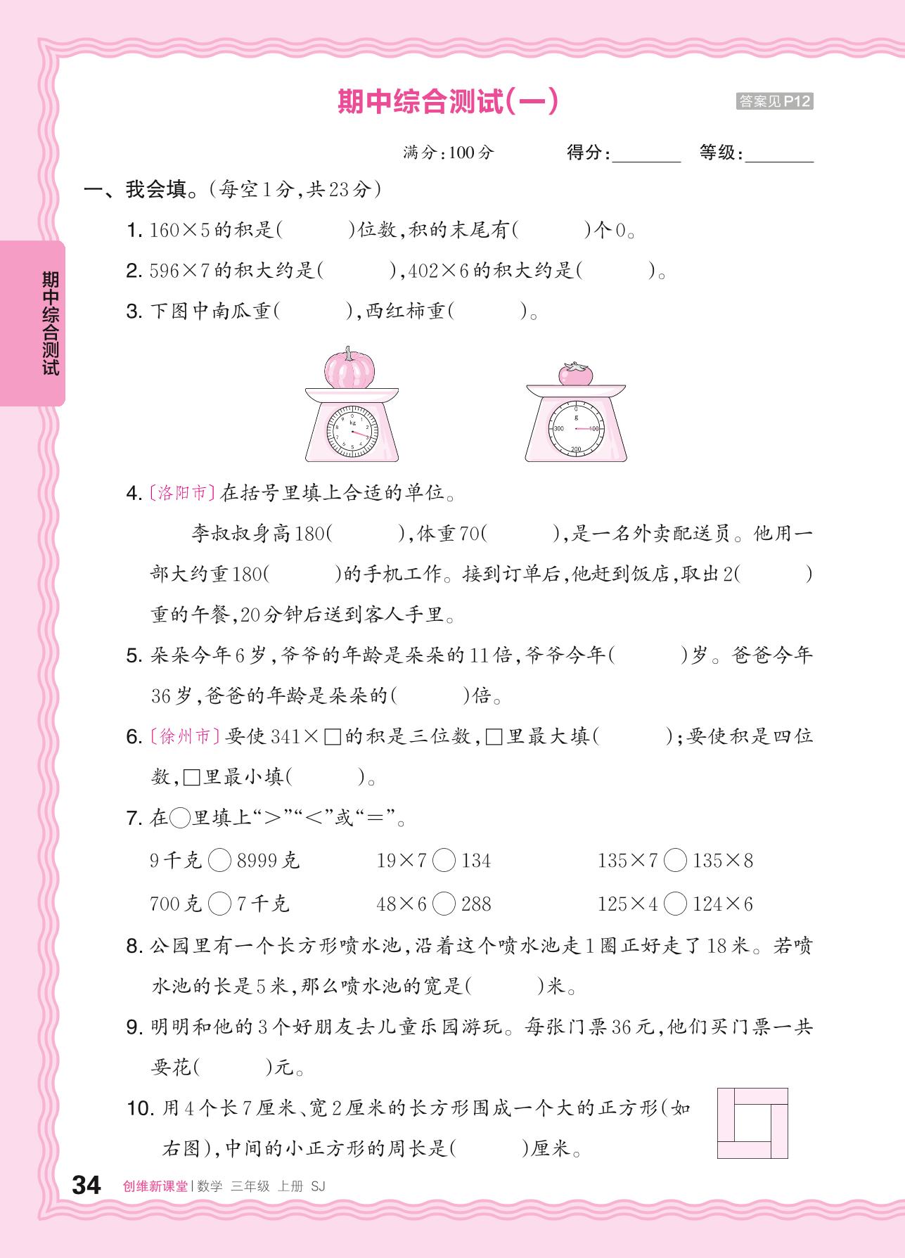 2024秋上册三年级数学苏教版 期中综合测试(一)