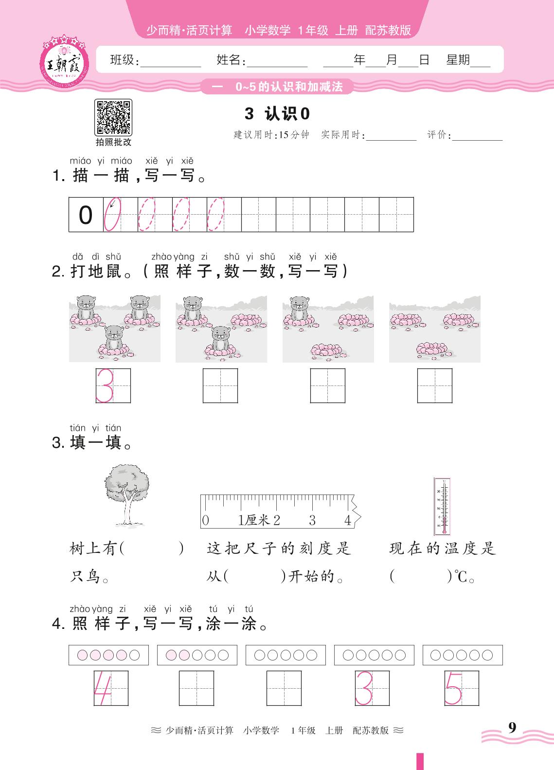 2024秋上册一年级数学苏教版 第一单元 0~5的认识和加减法——3. 认识0
