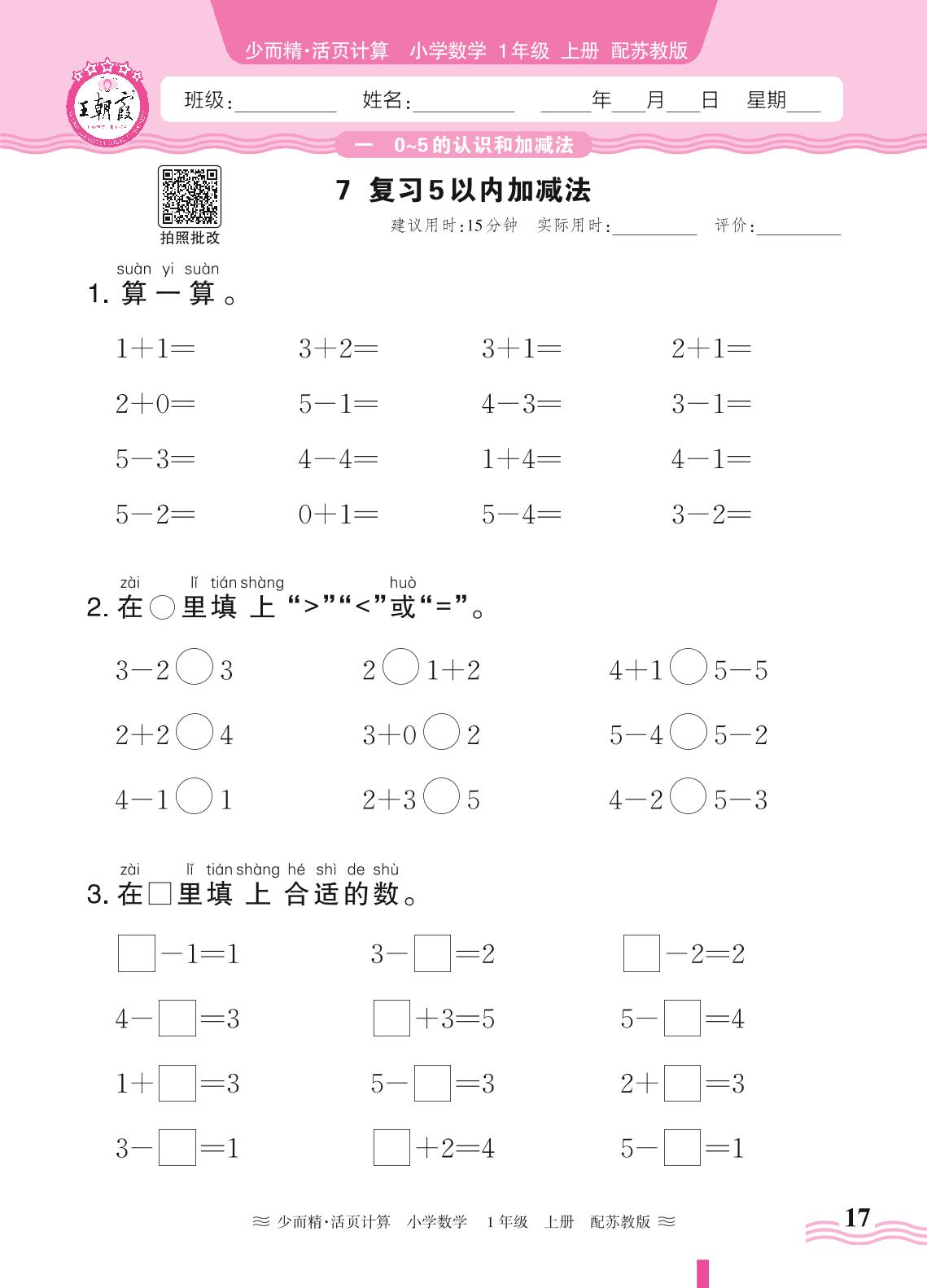 2024秋上册一年级数学苏教版 第一单元 0~5的认识和加减法——7. 复习5以内加减法