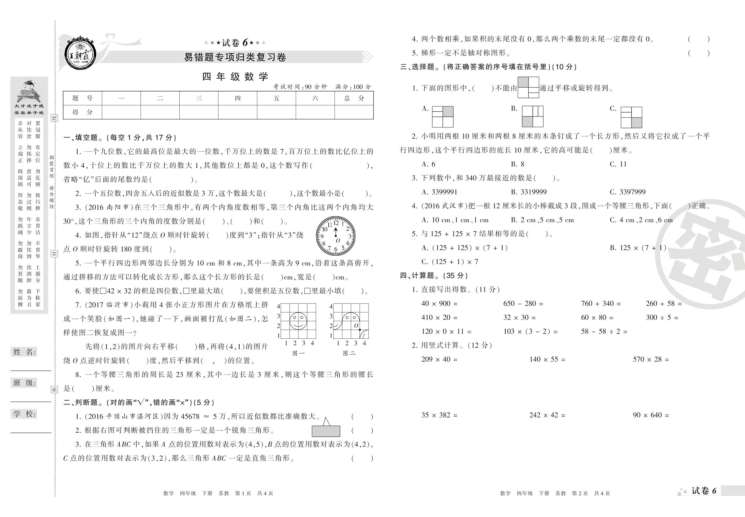 王朝霞期末专项卷——易错题专项归类复习卷四年级下册数学(苏教版)_R210804160127【6】