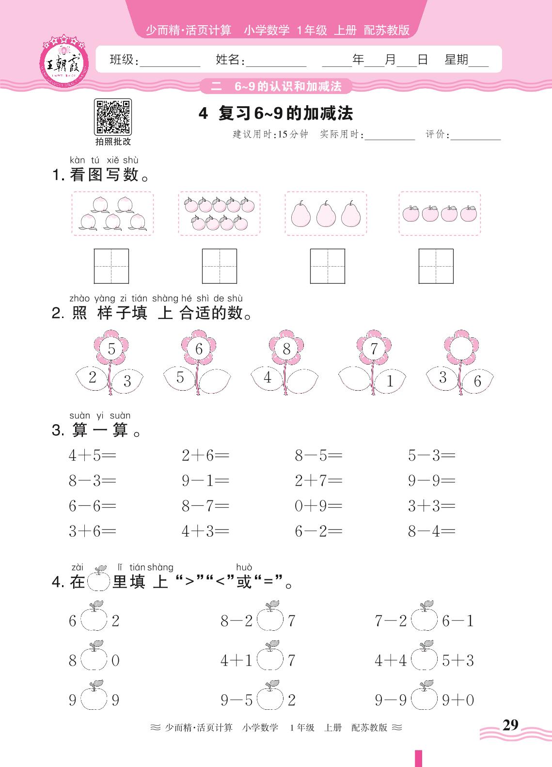 2024秋上册一年级数学苏教版 第二单元 6~9的认识和加减法——4. 复习6~9的加减法