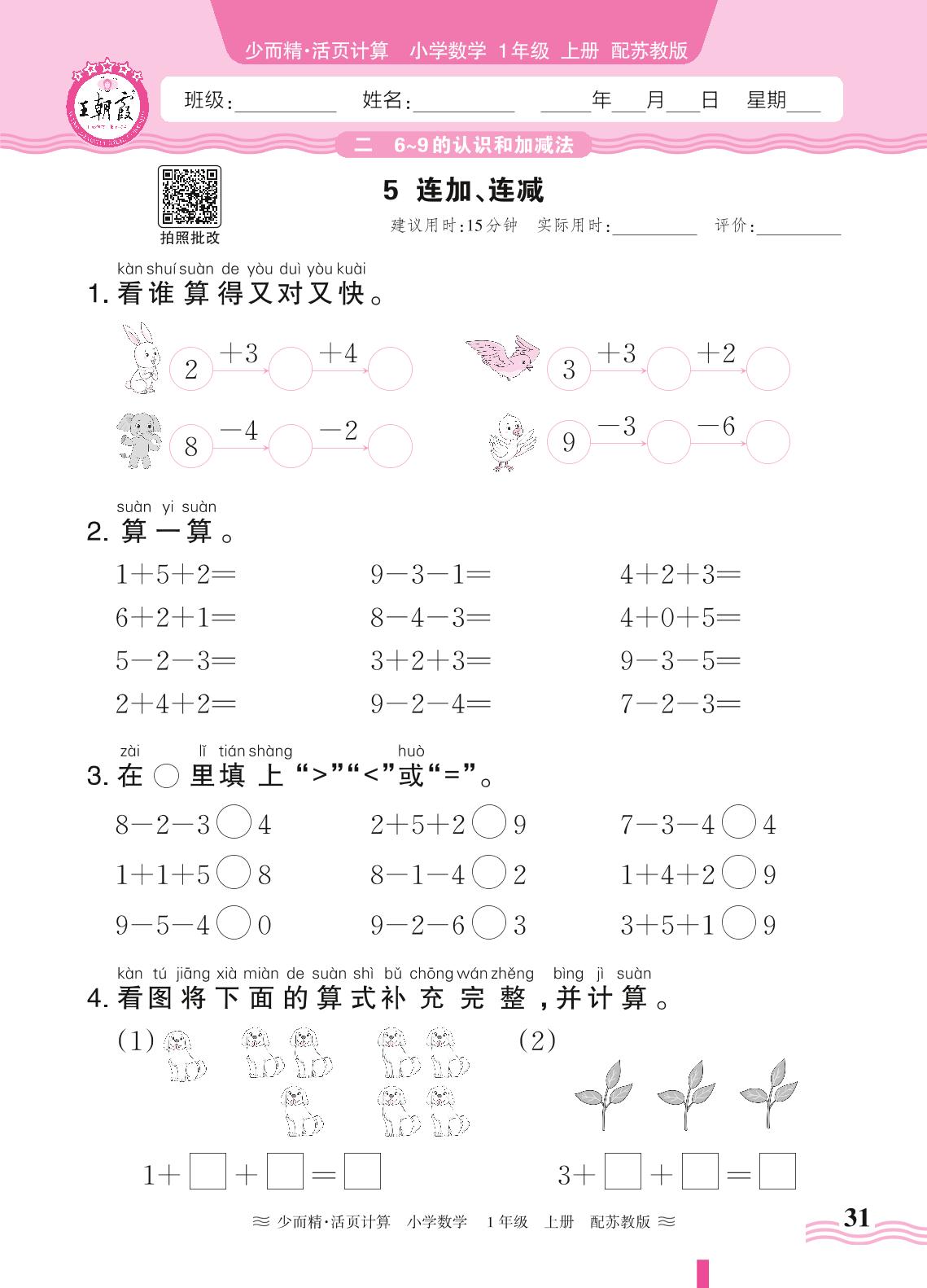 2024秋上册一年级数学苏教版 第二单元 6~9的认识和加减法——5. 连加、连减_R240819181321921