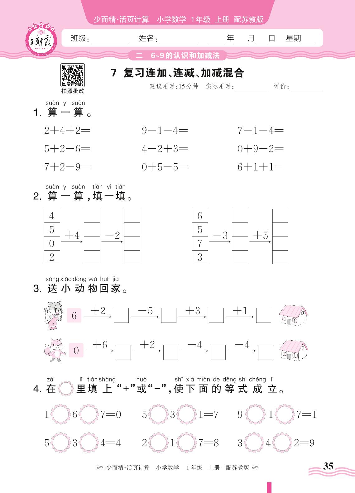 2024秋上册一年级数学苏教版 第二单元 6~9的认识和加减法——7. 复习连加、连减、加减混合