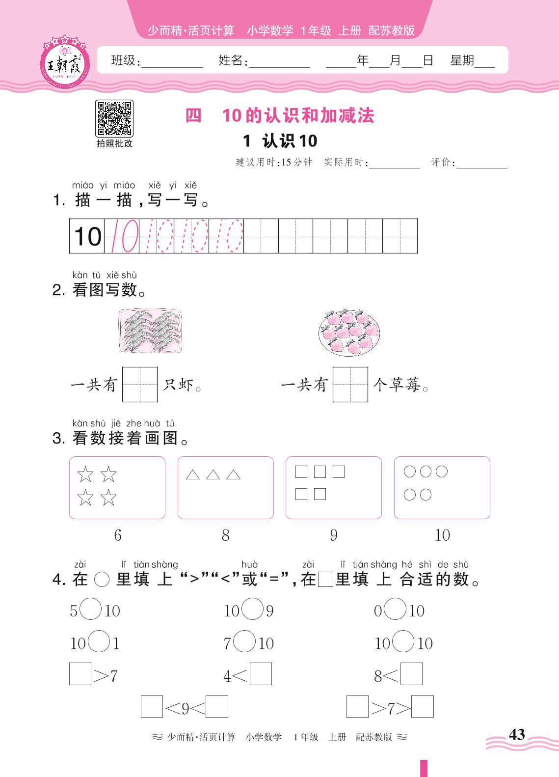 2024秋上册一年级数学苏教版 第四单元 10的认识和加减法——1. 认识10_R240819181323172