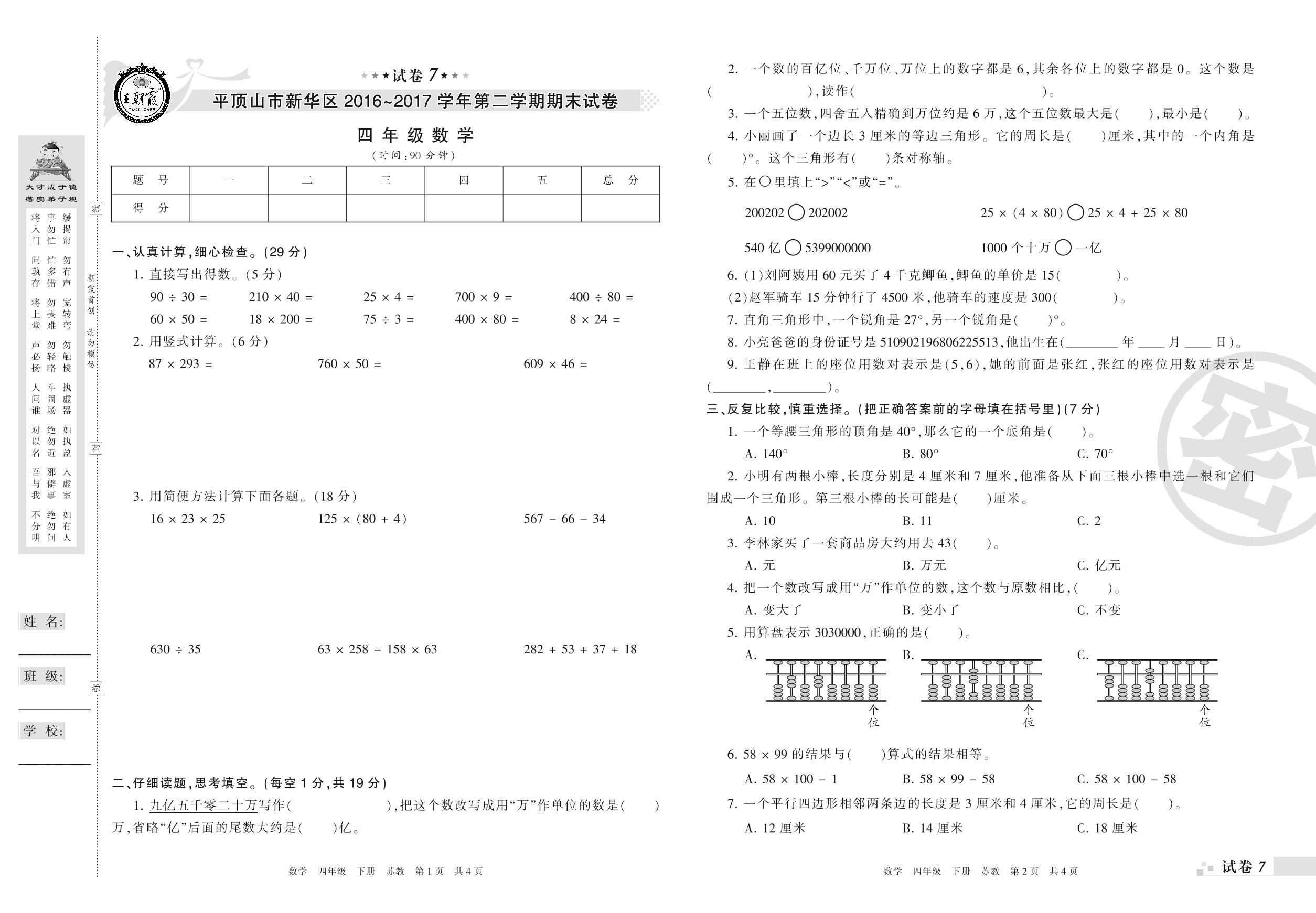2016-2017学年第二学期平顶山市新华区四年级数学试卷(苏教版)【7】