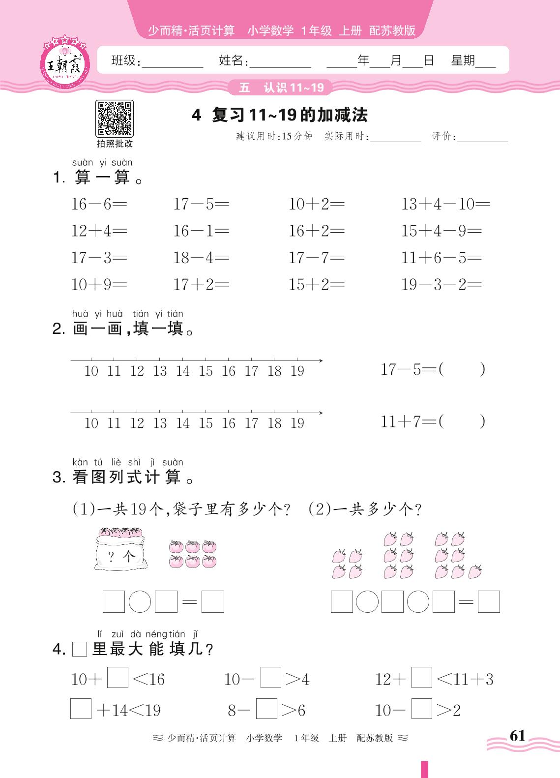 2024秋上册一年级数学苏教版 第五单元 认识11~19——4. 复习11~19的加减法