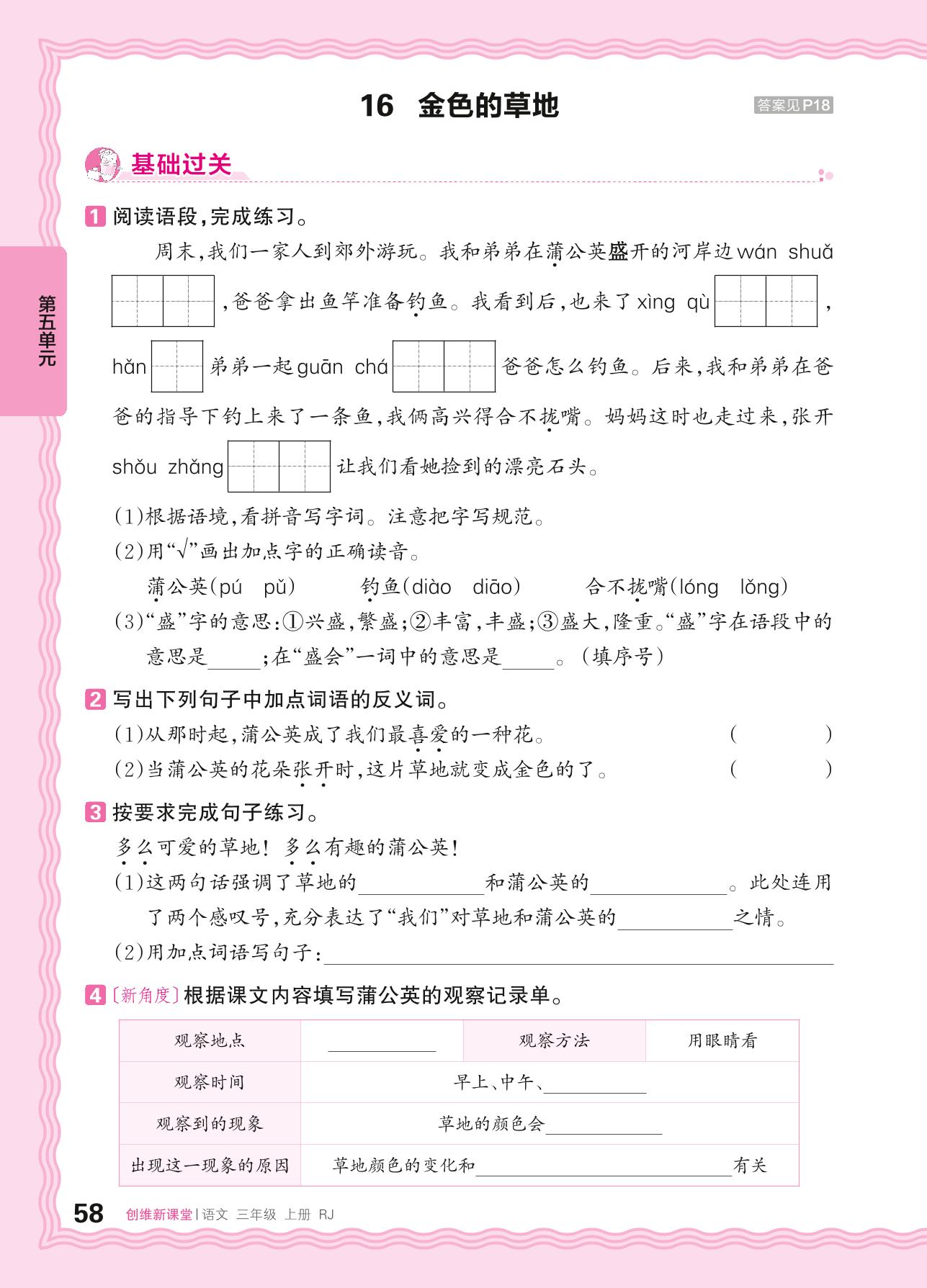 2024秋上册三年级语文人教版 第五单元 留心观察——16. 金色的草地