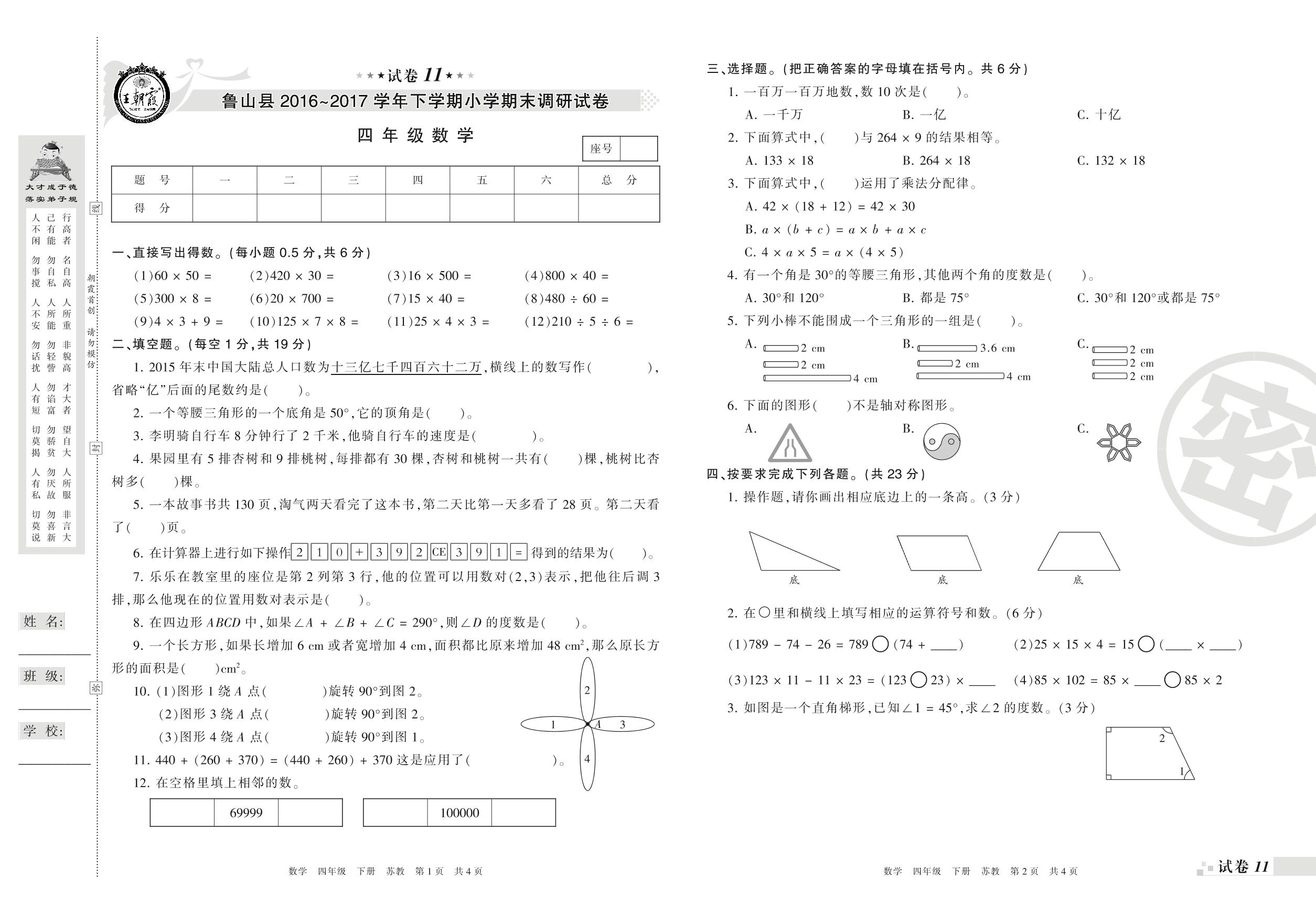 2016-2017学年第二学期平顶山市鲁山县四年级数学试卷(苏教版)【11】