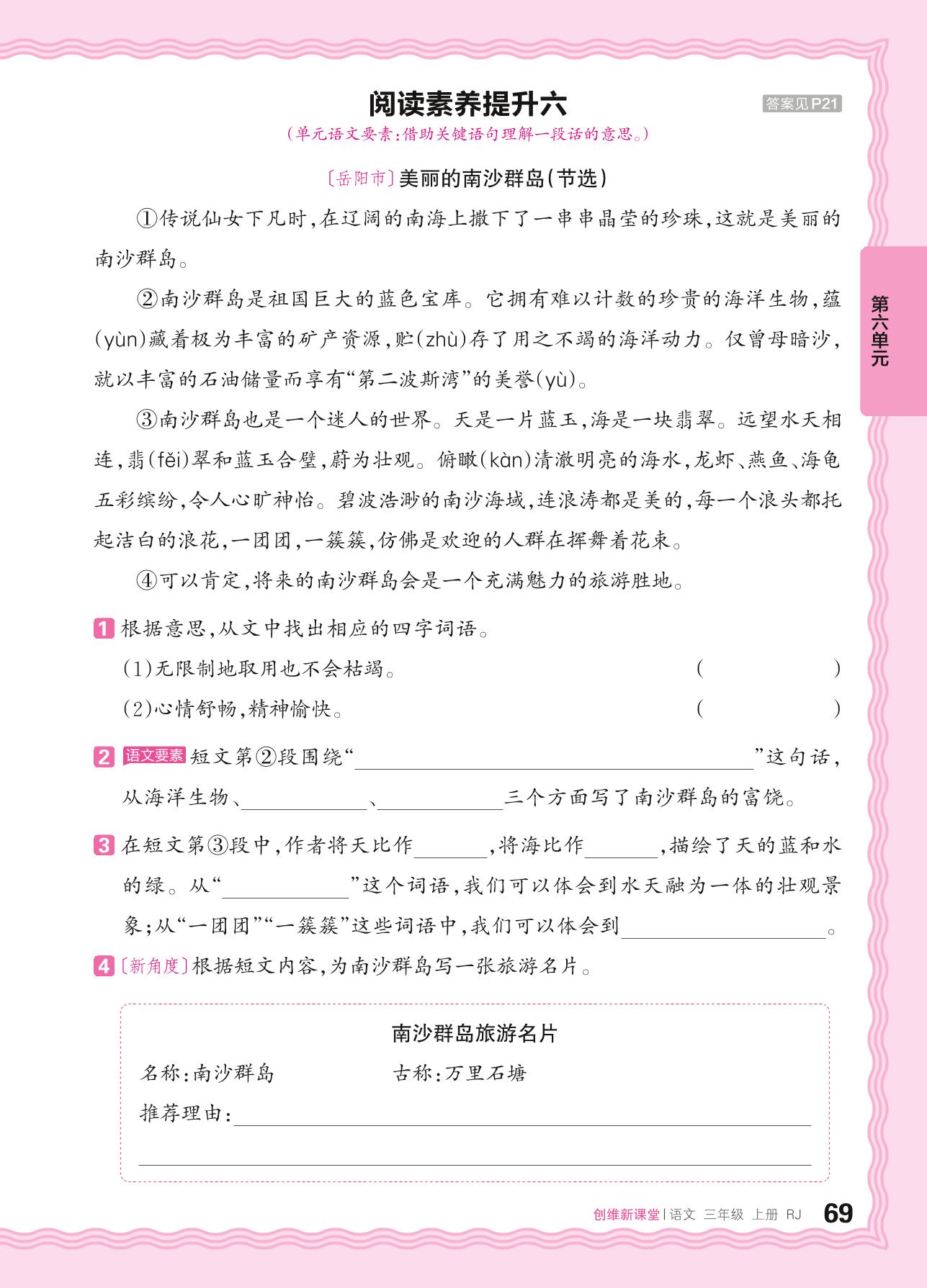 2024秋上册三年级语文人教版 第六单元 祖国河山——阅读素养提升六