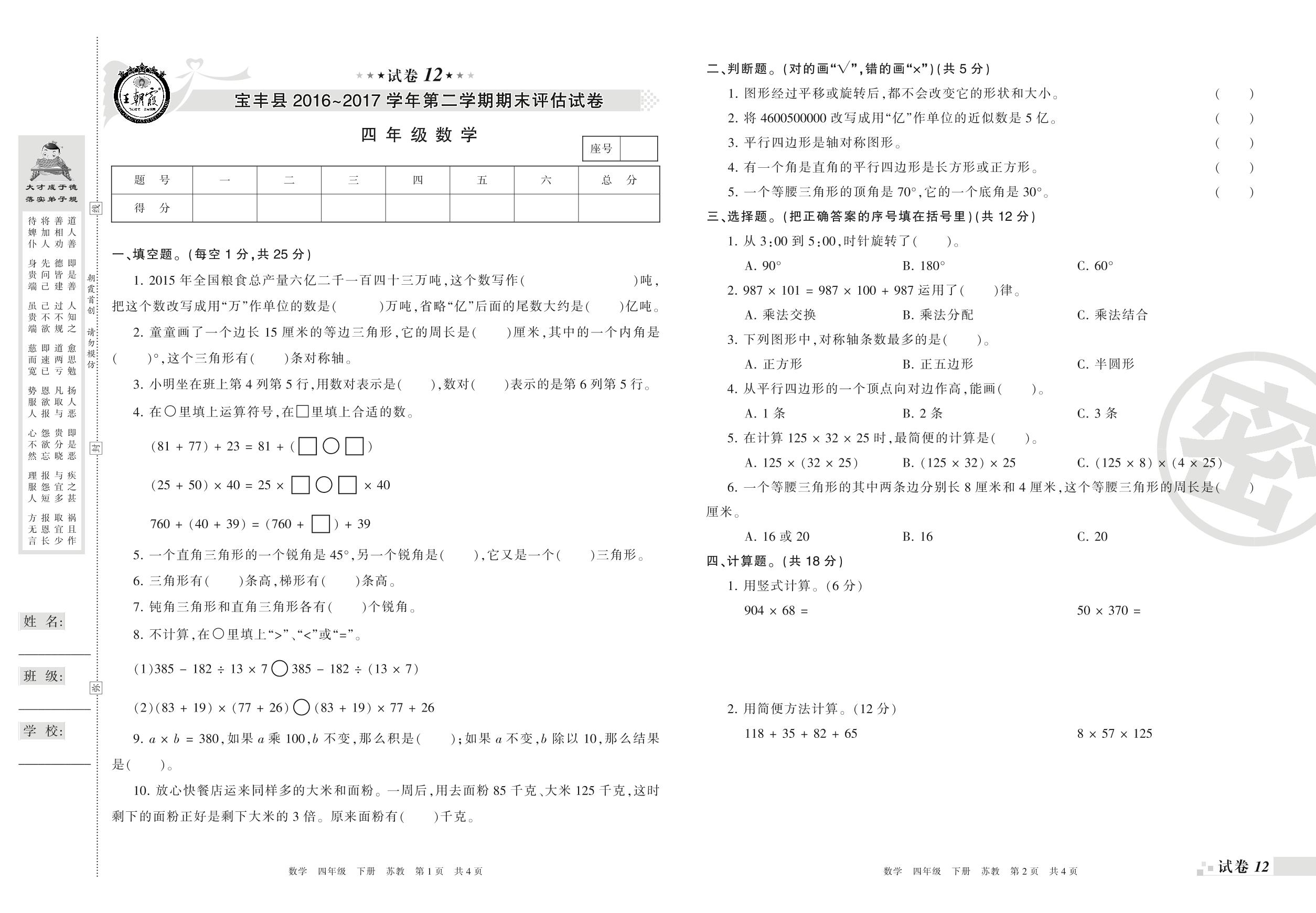 2016-2017学年第二学期平顶山市宝丰县四年级数学试卷(苏教版)【12】