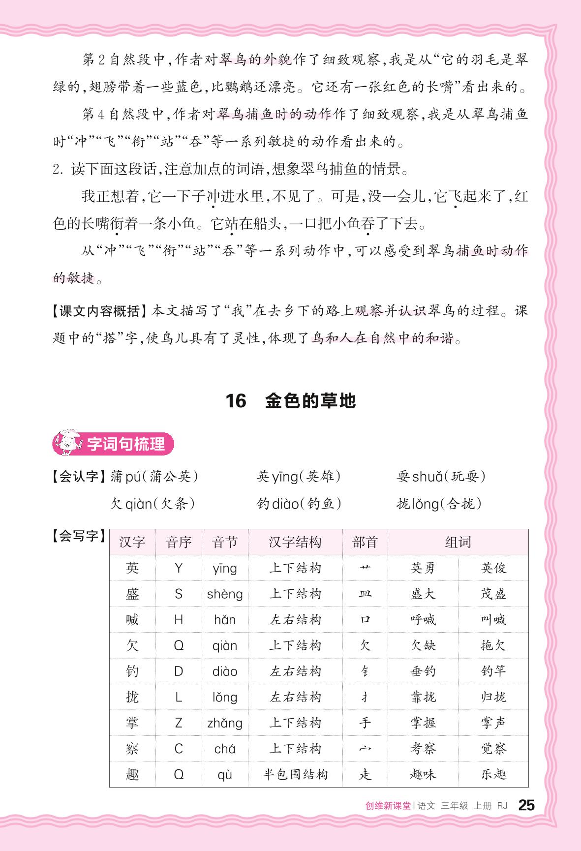 2024秋上册三年级语文人教版 助学手册 第五单元——16. 金色的草地