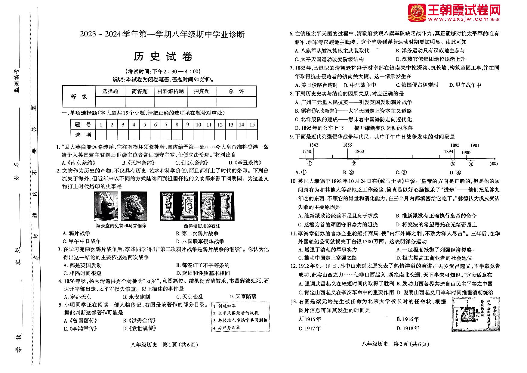 山西省太原市2023-2024学年第一学期期中学业诊断八年级历史(人教版)