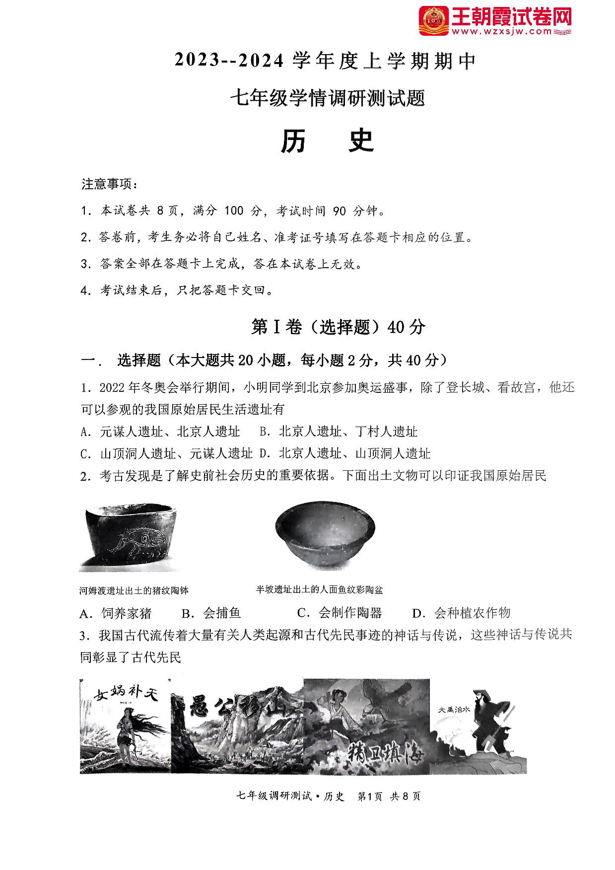 山西省朔州市怀仁市2023-2024学年度上学期期中学情调研测试题七年级历史(人教版)