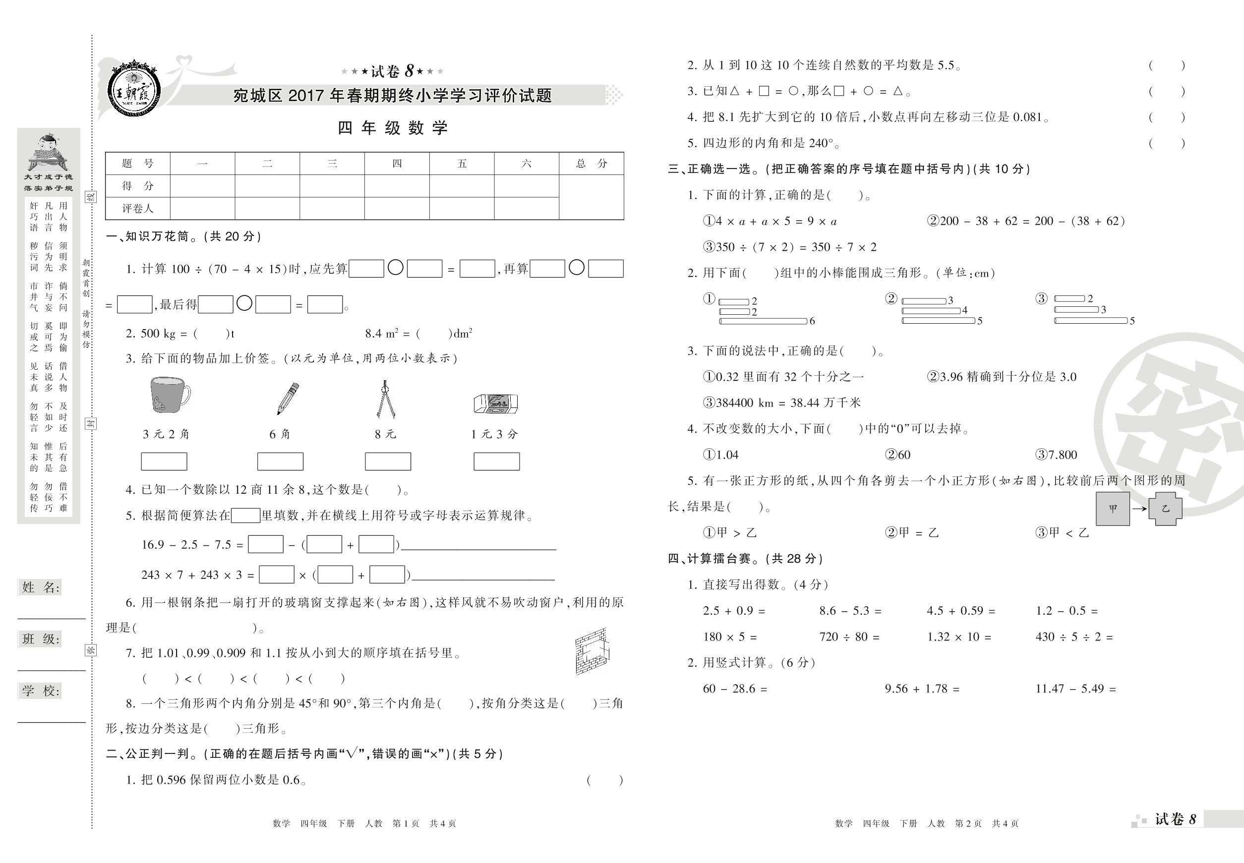2016-2017学年第二学期南阳市宛城区四年级数学试卷(人教版)【8】