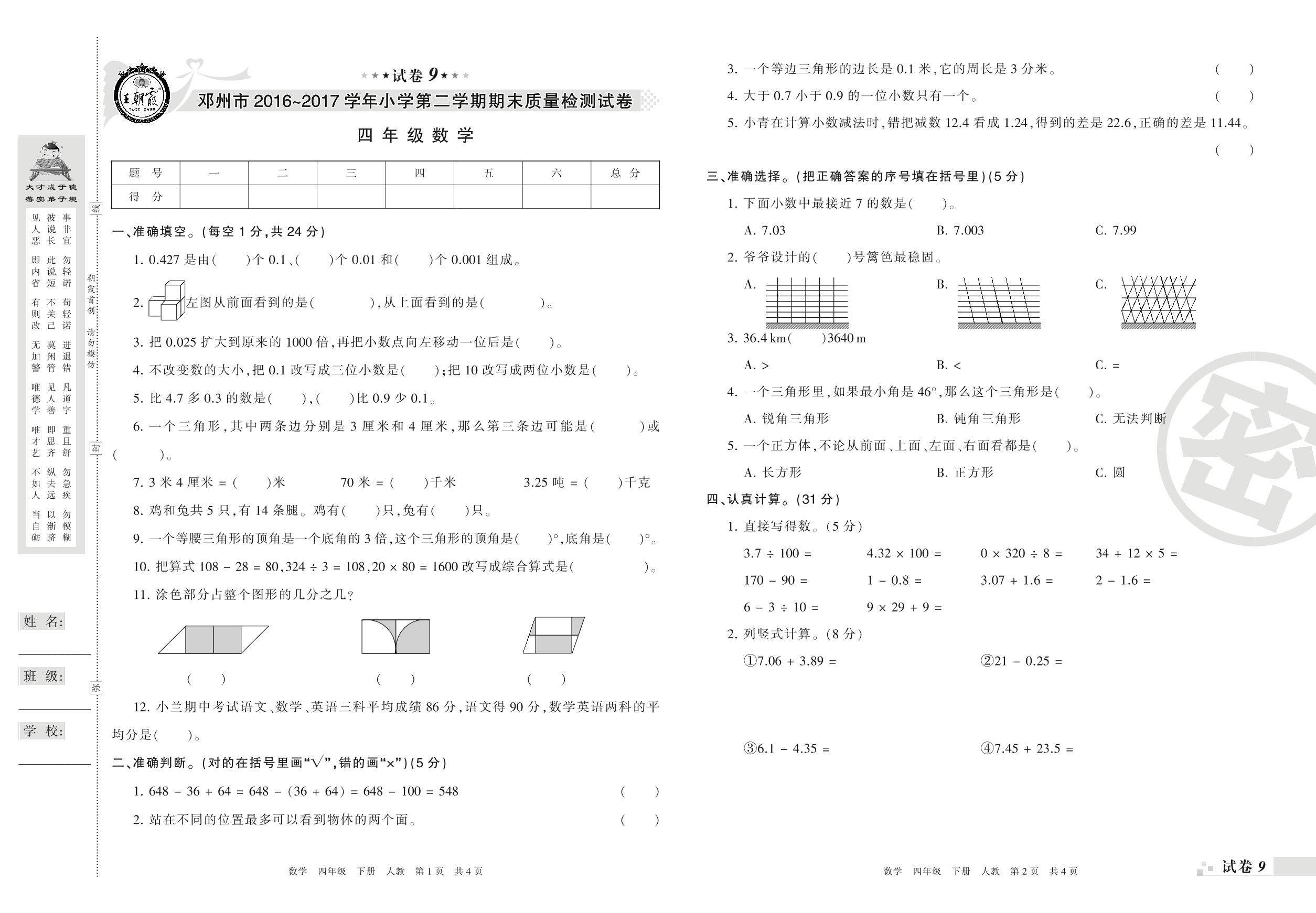 2016-2017学年第二学期邓州市四年级数学试卷(人教版)【9】