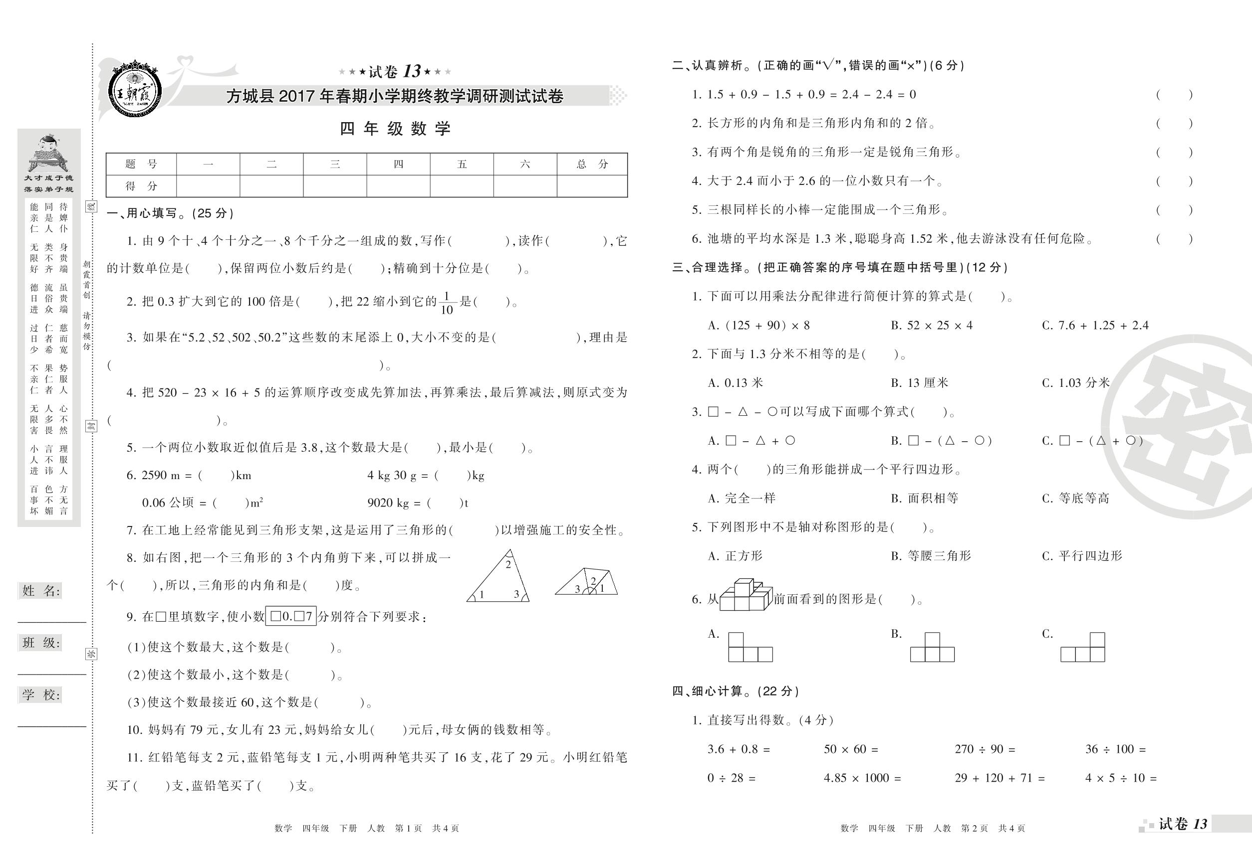 2016-2017学年第二学期南阳市方城县四年级数学试卷(人教版)【13】