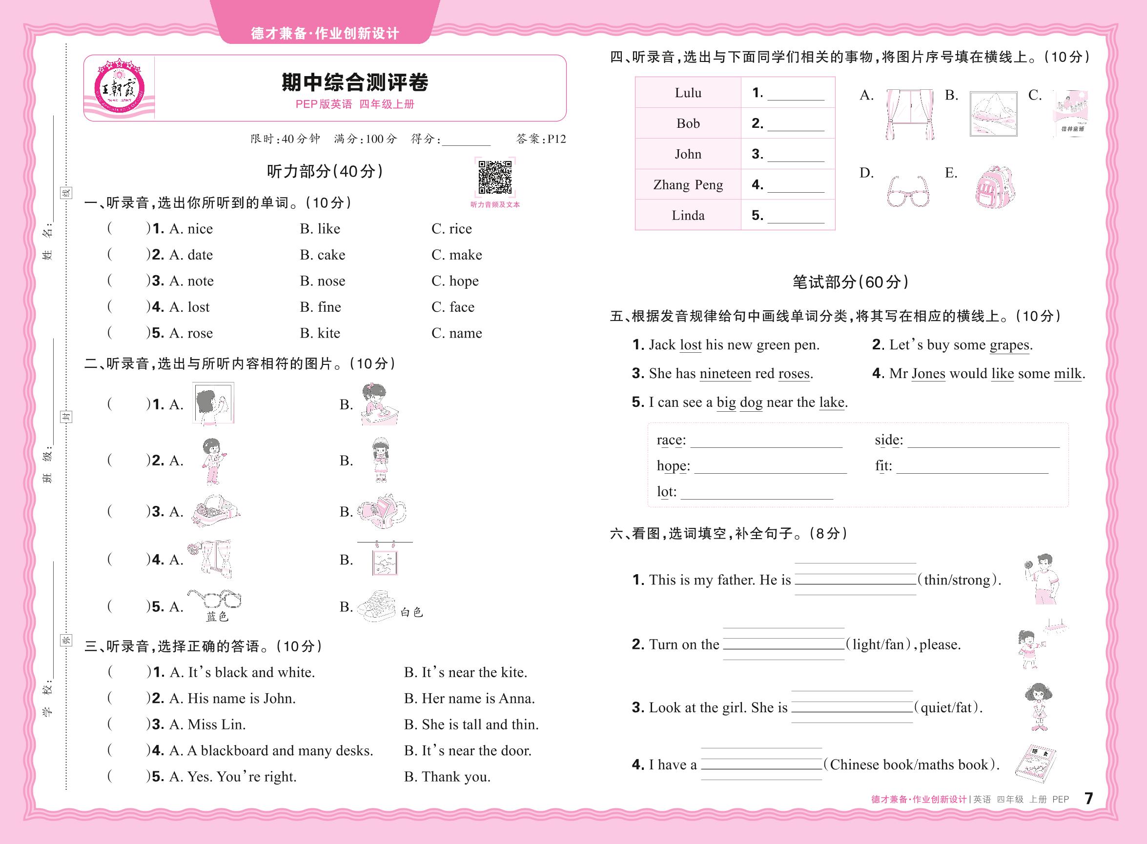 四年级英语人教PEP版(三起始)上册期中卷