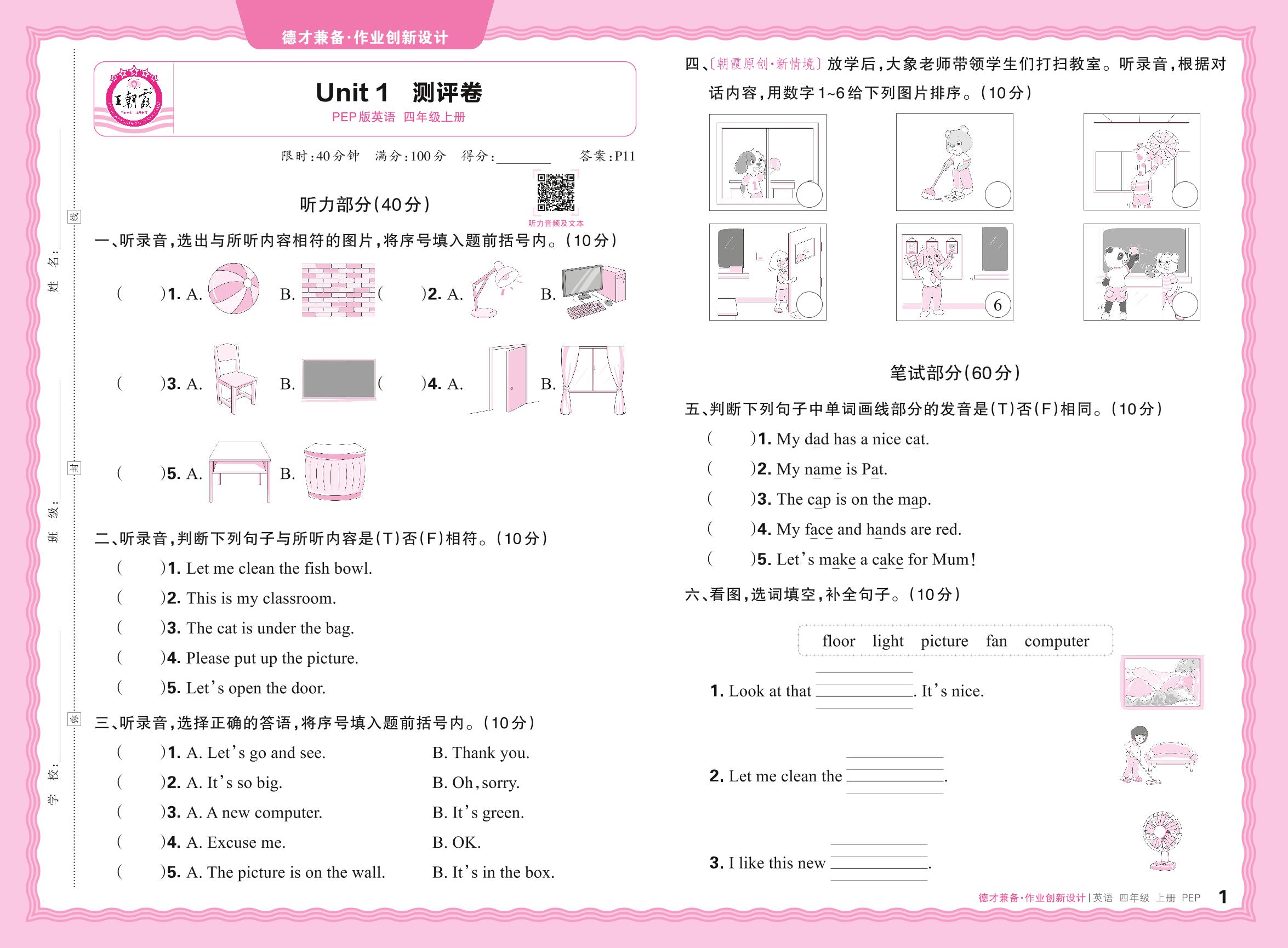 2024秋上册四年级英语人教PEP版(三起始) Unit 1 测评卷