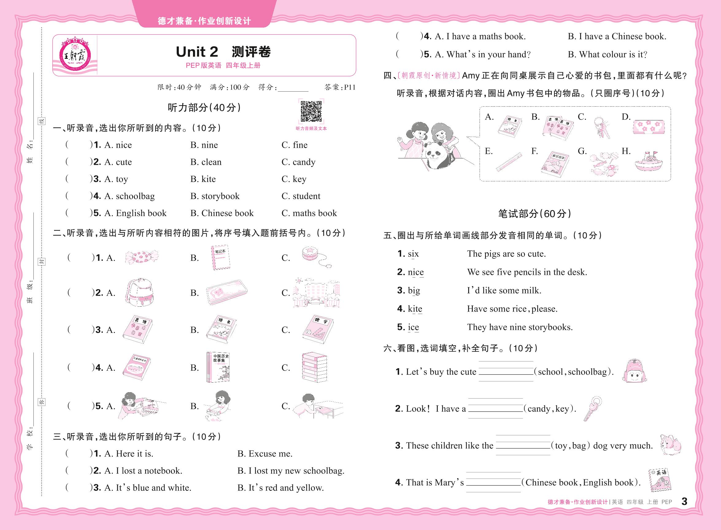 2024秋上册四年级英语人教PEP版(三起始) Unit 2 测评卷