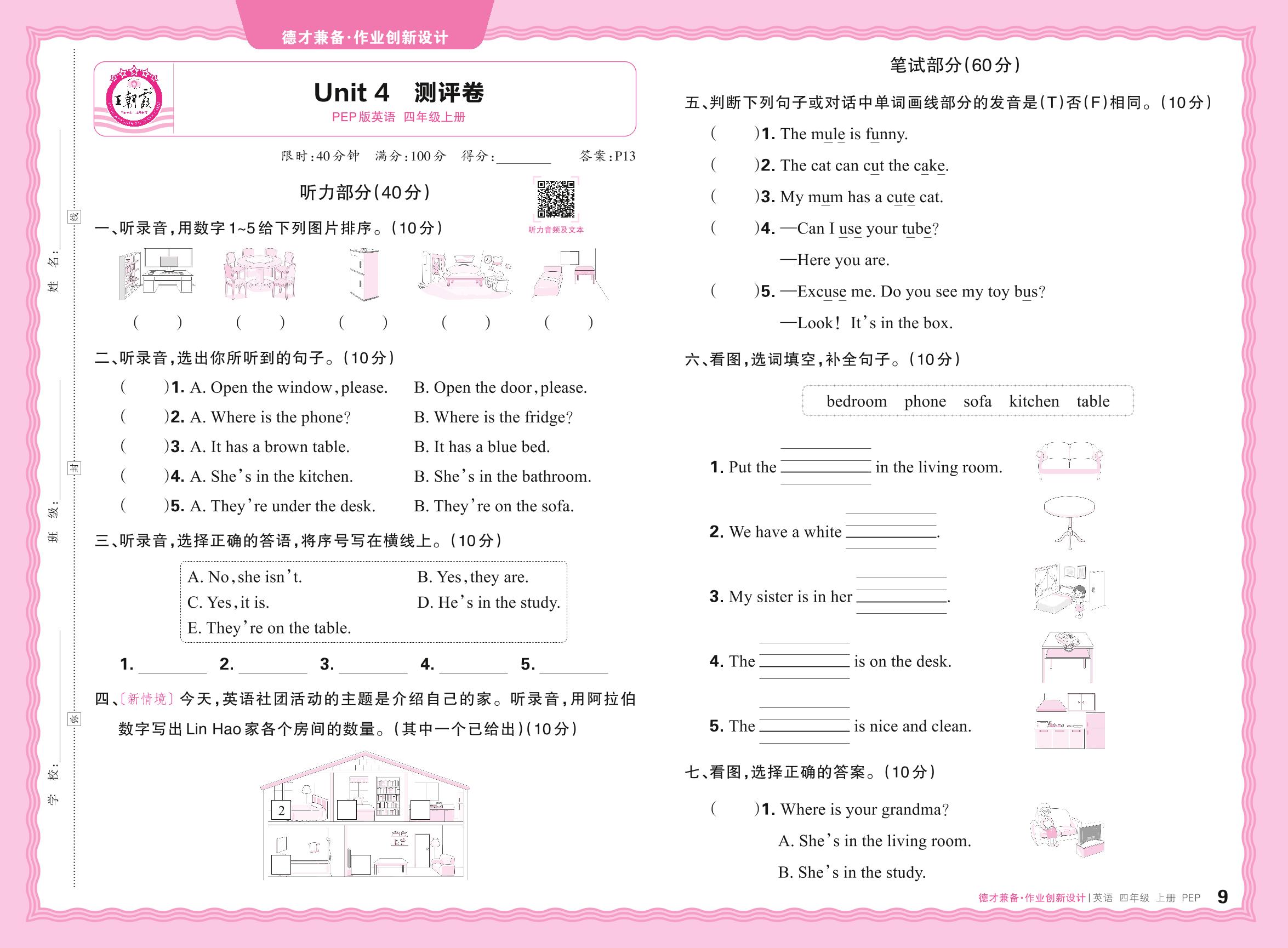 2024秋上册四年级英语人教PEP版(三起始) Unit 4 测评卷