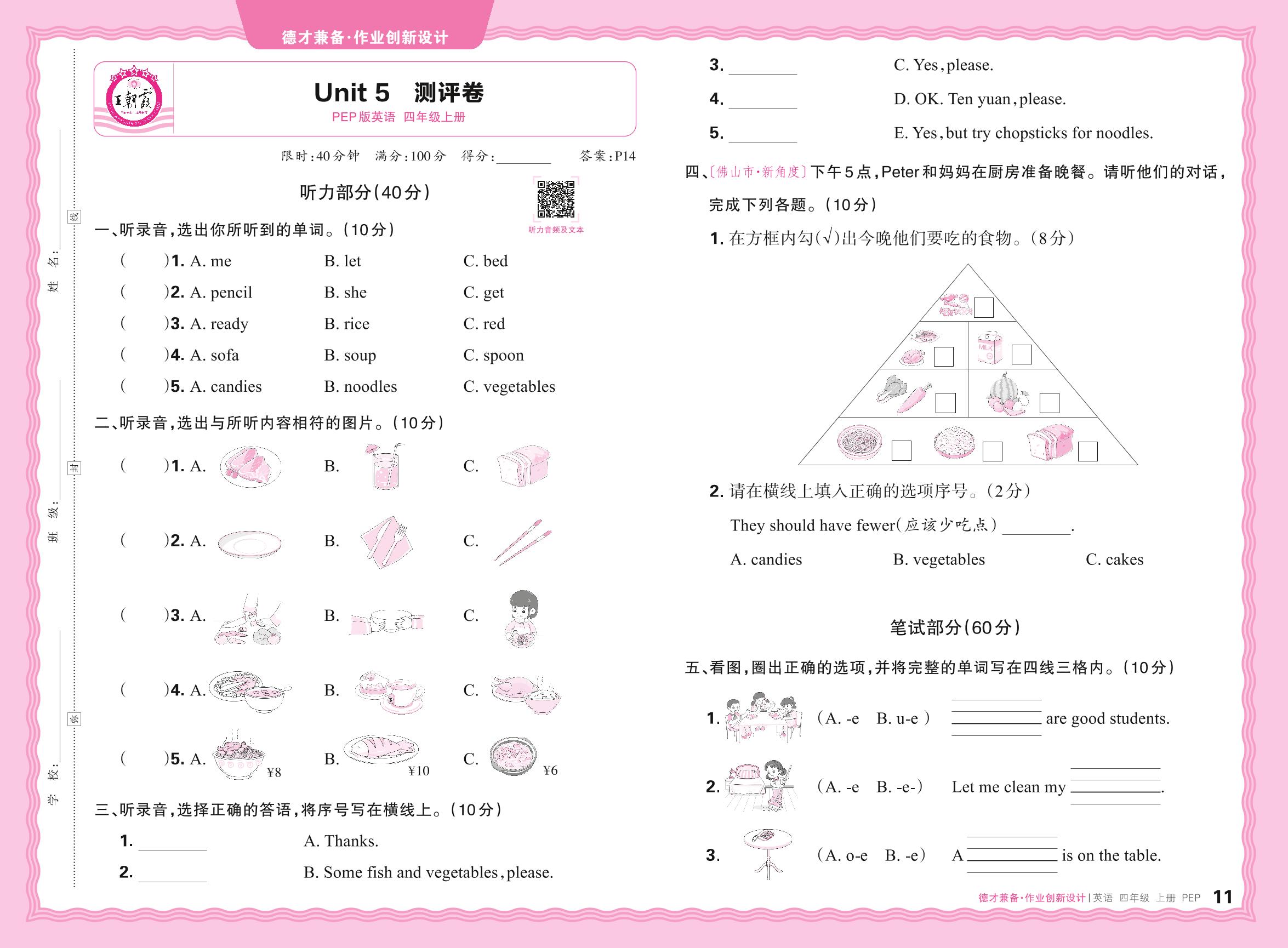 2024秋上册四年级英语人教PEP版(三起始) Unit 5 测评卷