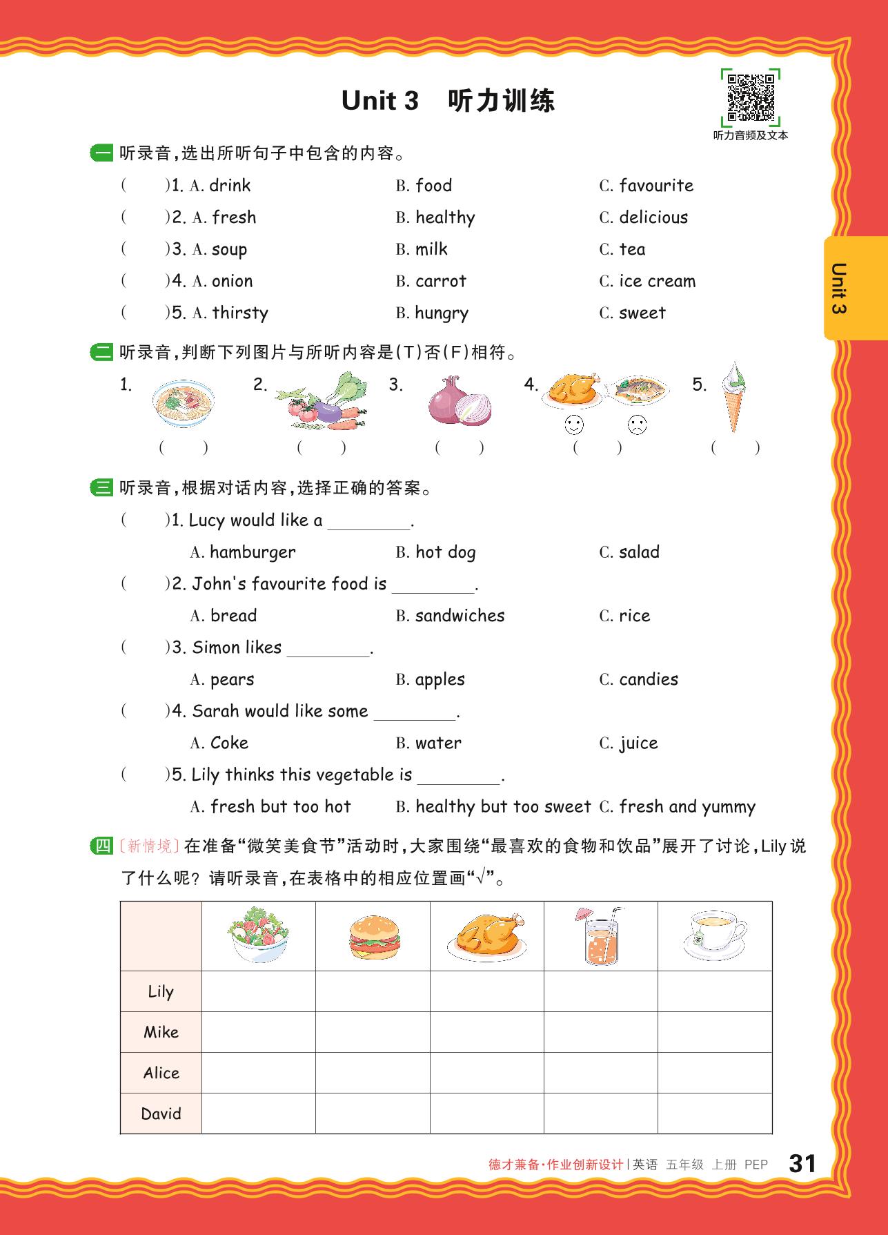 2024秋上册五年级英语人教PEP版(三起始) Unit 3 听力训练