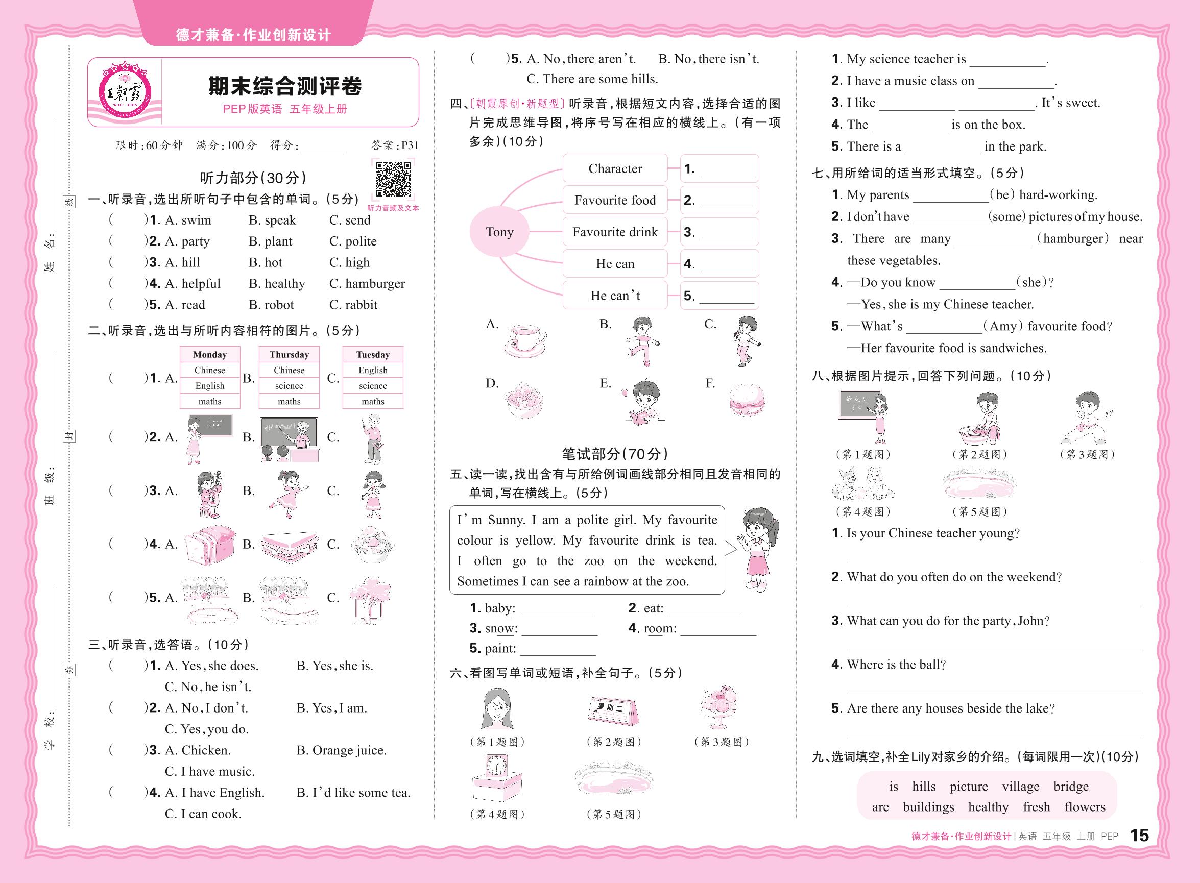 2024秋上册五年级英语人教PEP版(三起始) 期末综合测评卷