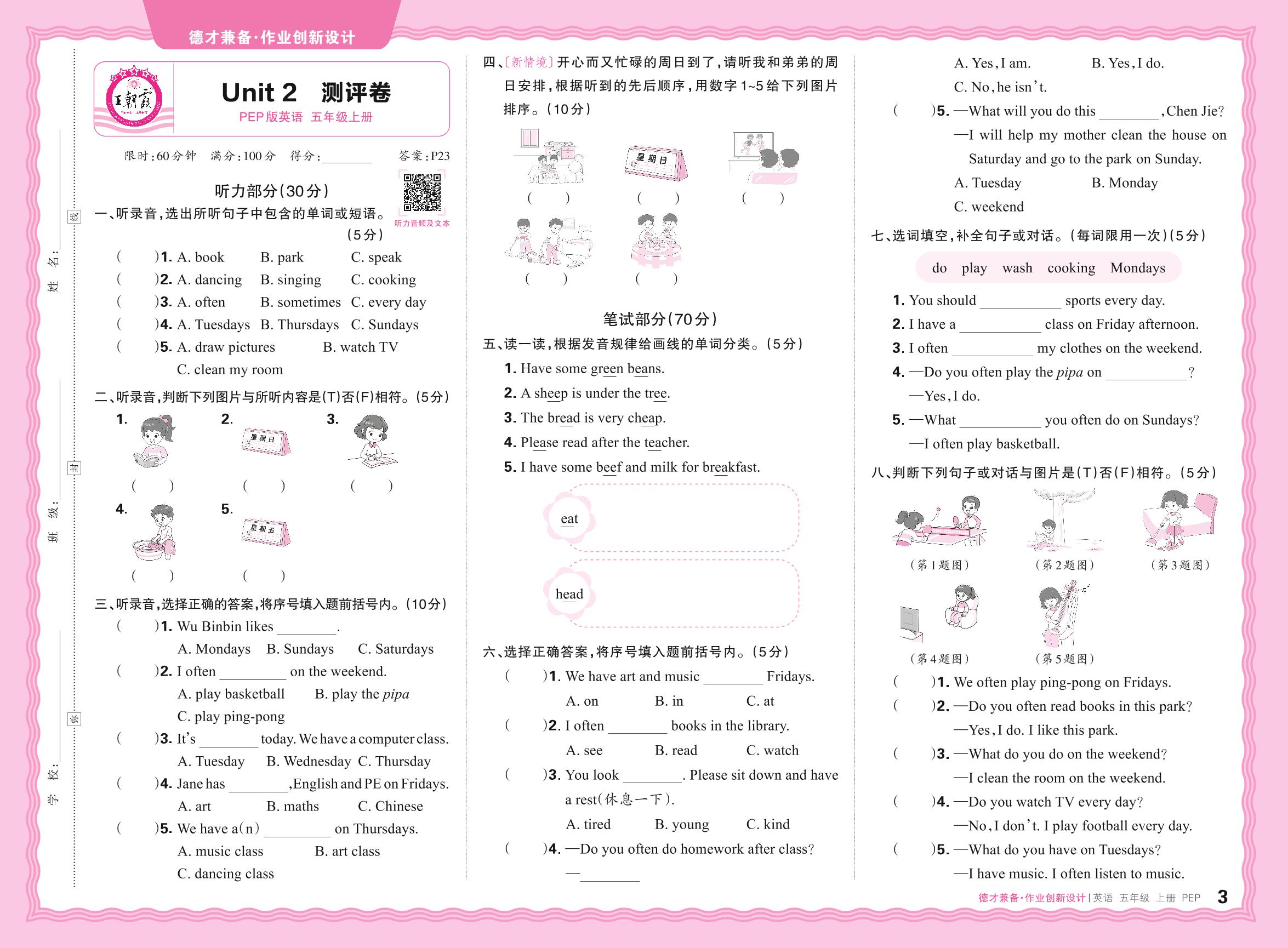 五年级英语人教PEP版(三起始)上册单元卷